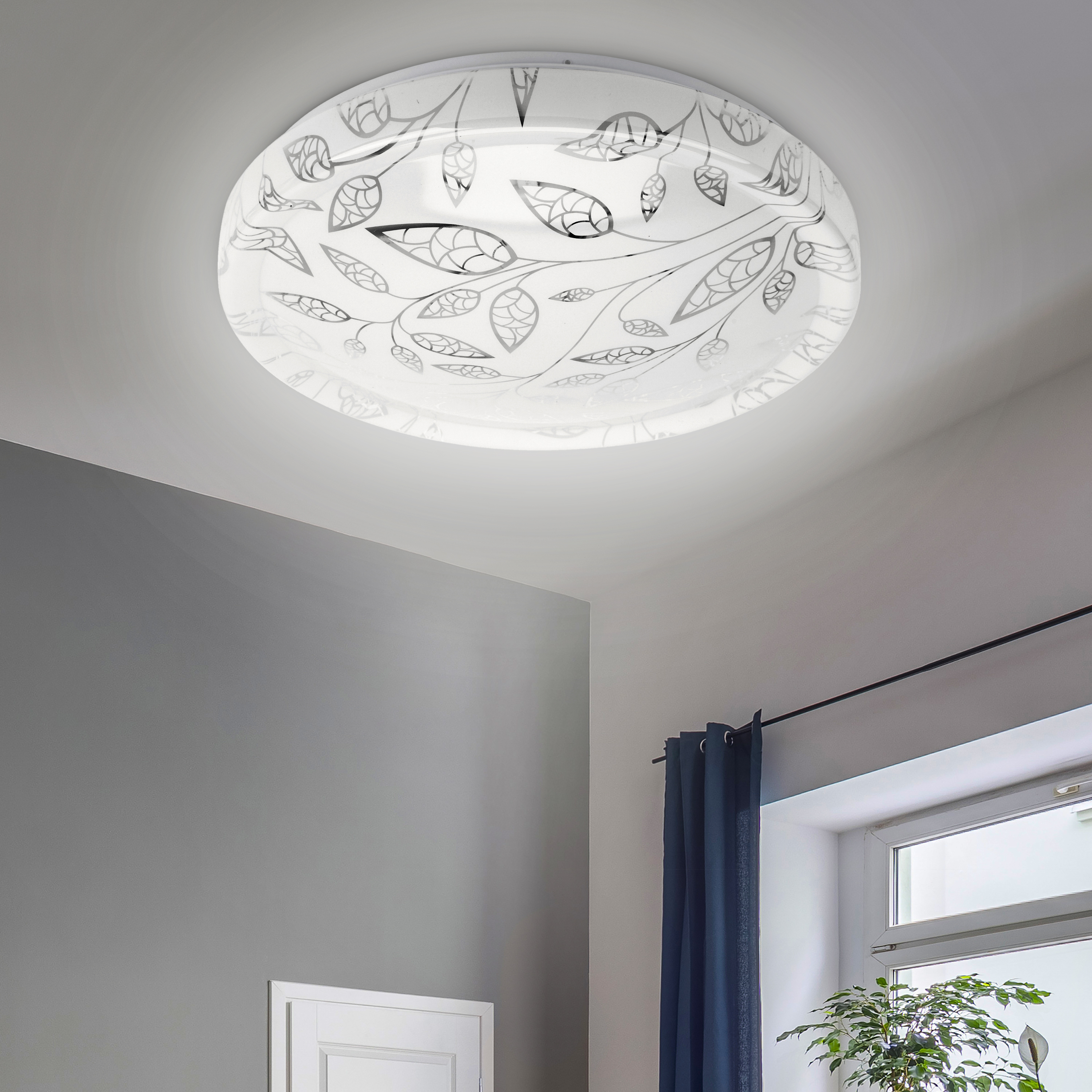 Плафон LED люстры декорирован изящным узором. Нежные ветки с лепестками гармонично смотрятся на круглом плоском корпусе. Такой светильник прекрасно подойдет для оформления гостиной, коридора, спальни или детской.