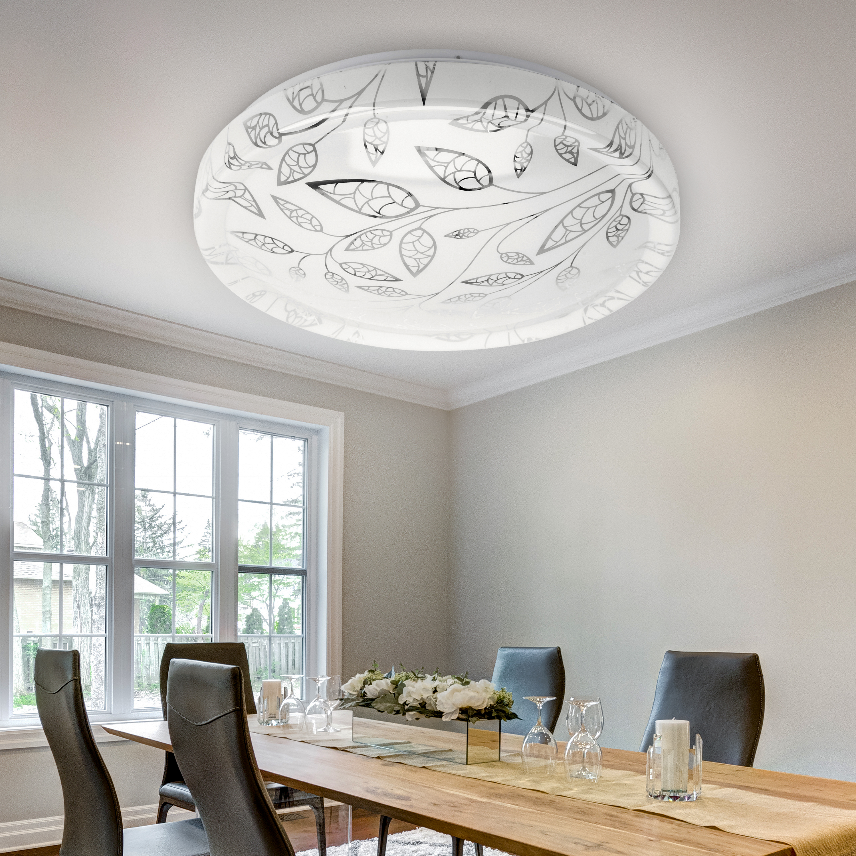 Плафон LED люстры декорирован изящным узором. Нежные ветки с лепестками гармонично смотрятся на круглом плоском корпусе. Такой светильник прекрасно подойдет для оформления гостиной, коридора, спальни или детской.