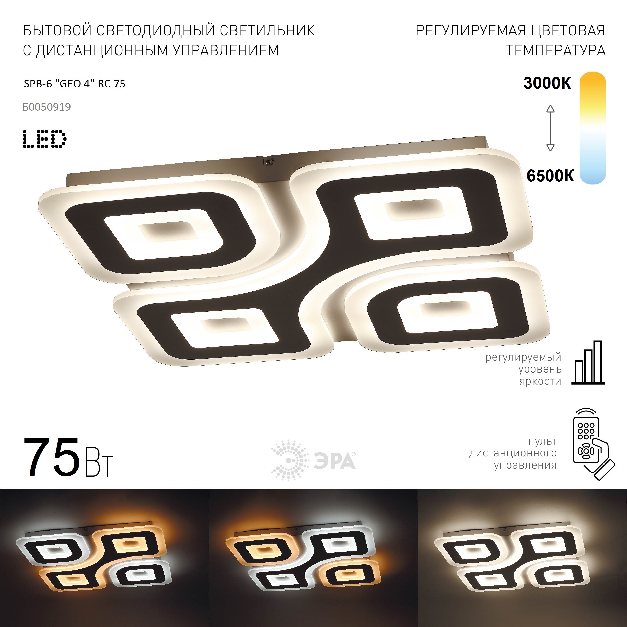 Светильник потолочный SPB-6 "GEO 4" мощностью на 75 Вт. Эта лампа станет современной альтернативой громоздким люстрам, позволит разнообразить интерьер за счет дизайна, а также сделает возможным выбор комфортной для Вас цветовой температуры без дополнительных затрат. В комплекте с люстрой идет пульт д/у, который станет Вашим главным помощником в регулировке изделия.