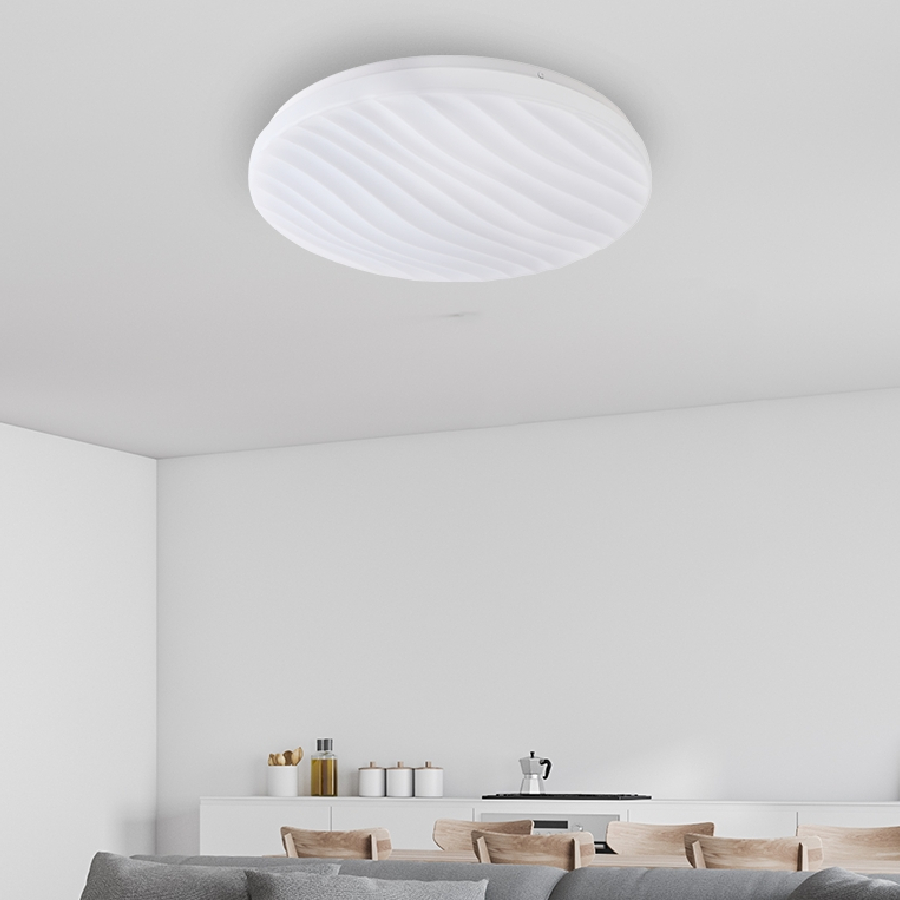 Отдельного внимания заслуживает дизайн плафона: рельефное оформление, напоминающее движение волн, идеально гармонирует с плоской круглой формой. Такая потолочная люстра эстетично украсит интерьер гостиной, спальни или коридора.