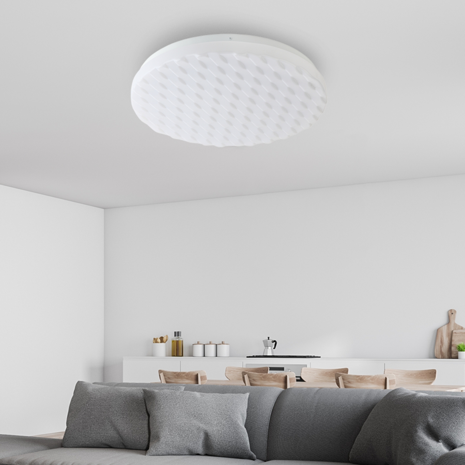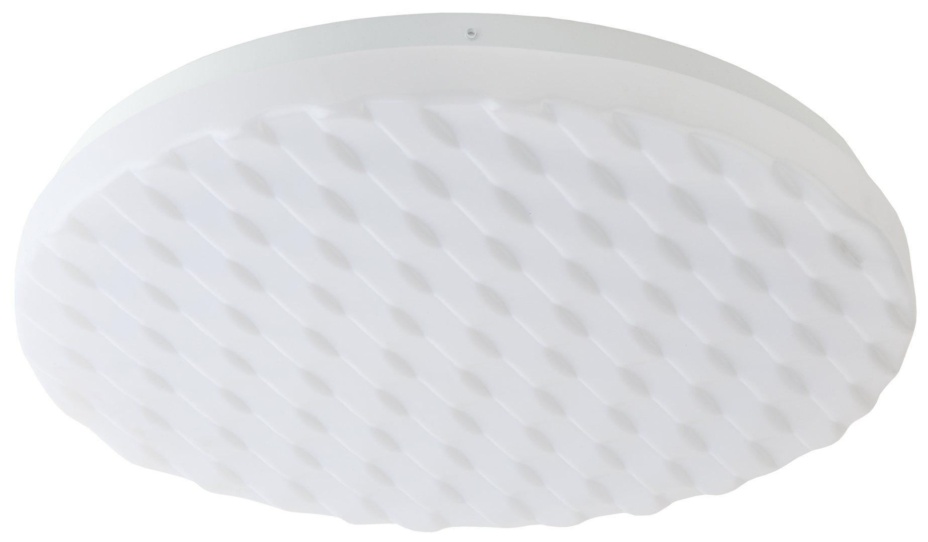 Футуристичный рельефный дизайн плафона идеально сочетается с круглым плоским корпусом. За счет этого электросветильник освежит интерьер гостиной, спальни или прихожей.