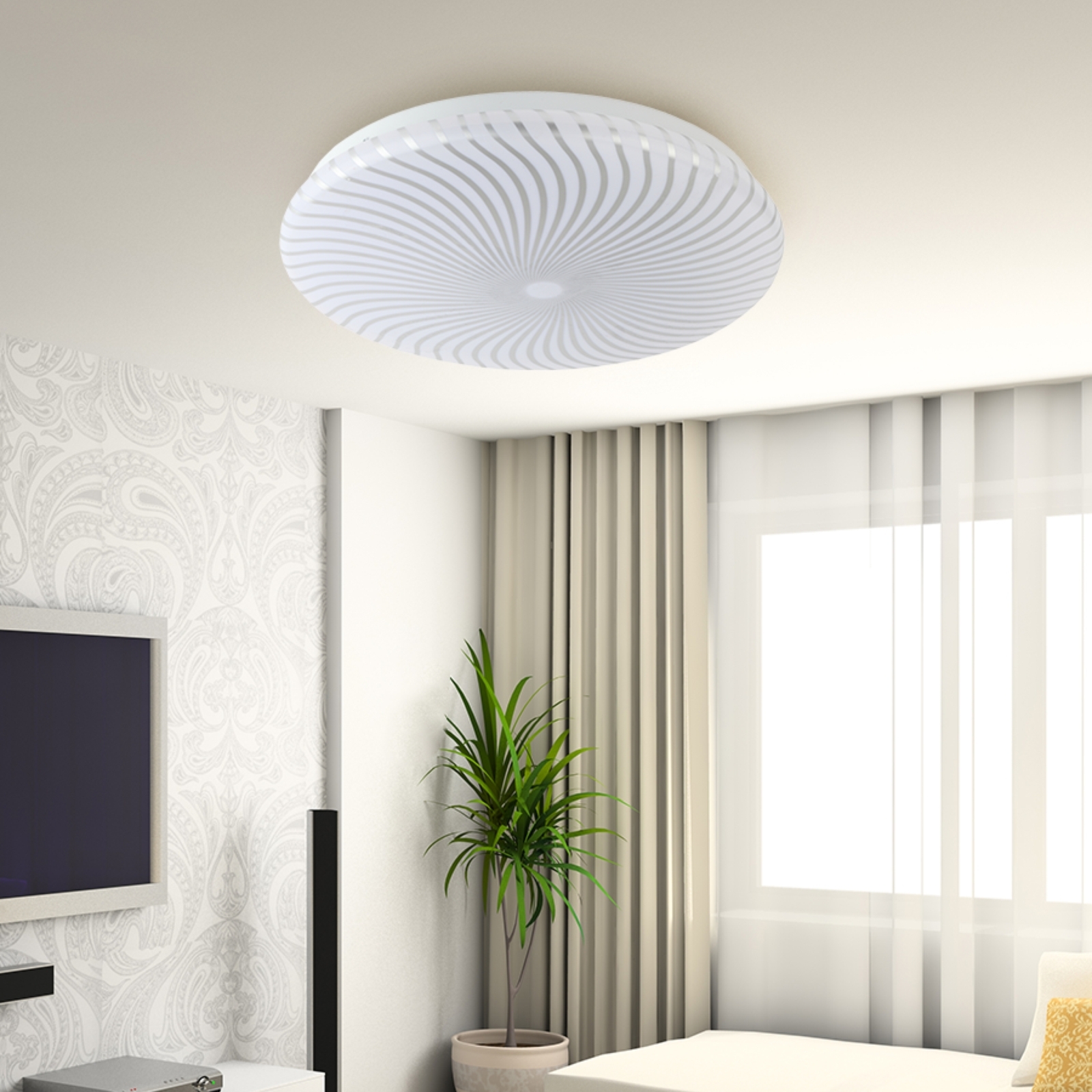 Дизайн рассеивателя не может не привлечь внимание. Динамичный блестящий узор идеально сочетается с круглым плоским корпусом. За счет этого электросветильник придаст кухне, спальне или прихожей утонченности и изыска.