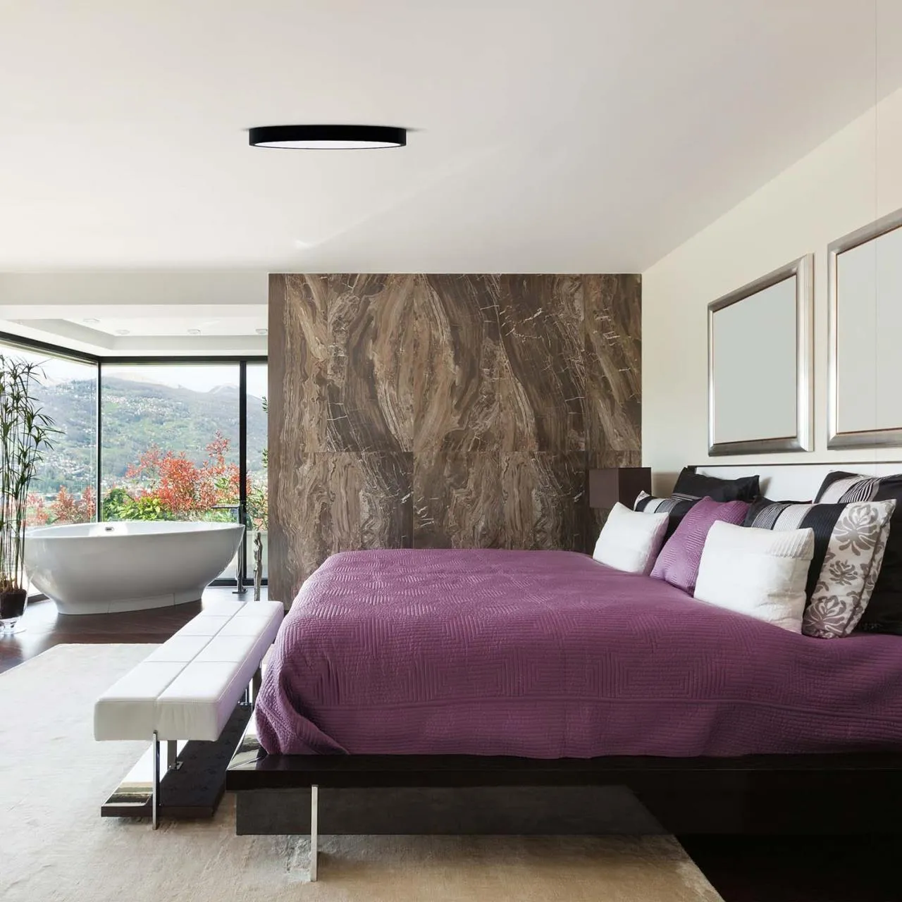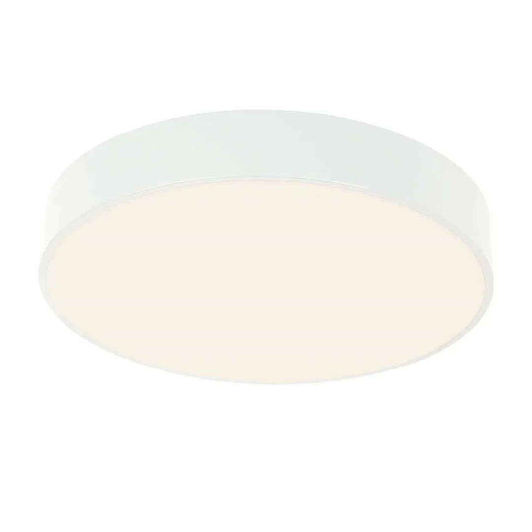 Каркас из металла белого цвета, белый плафон из непрозрачного акрила, LEDмодуль, регулируемая мощность и цветовая температура, пульт дистанционного управления в комплекте.