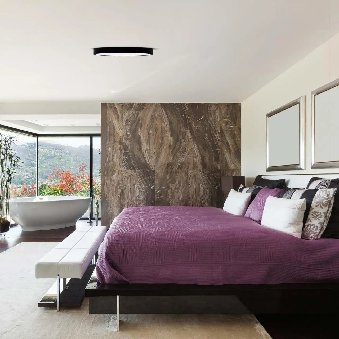 Каркас из металла черного матового цвета, белый плафон из непрозрачного акрила, LEDмодуль, регулируемая мощность и цветовая температура, пульт дистанционного управления в комплекте.