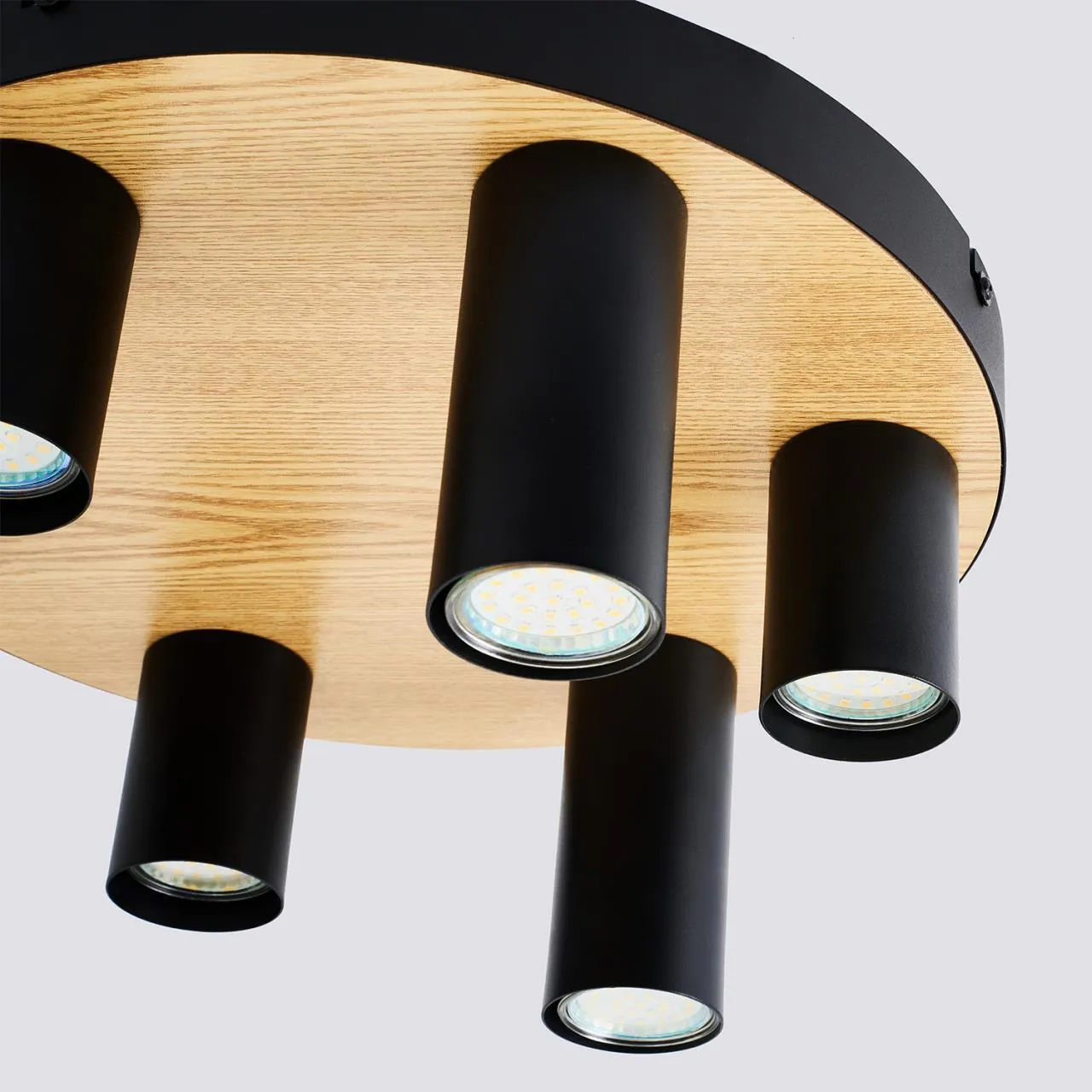 Металлический каркас черного цвета с декоративной вставкой из МДФ с фактурой дерева, черные матовые плафоны, лампа GU10 в комплект не входит.