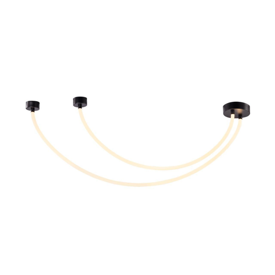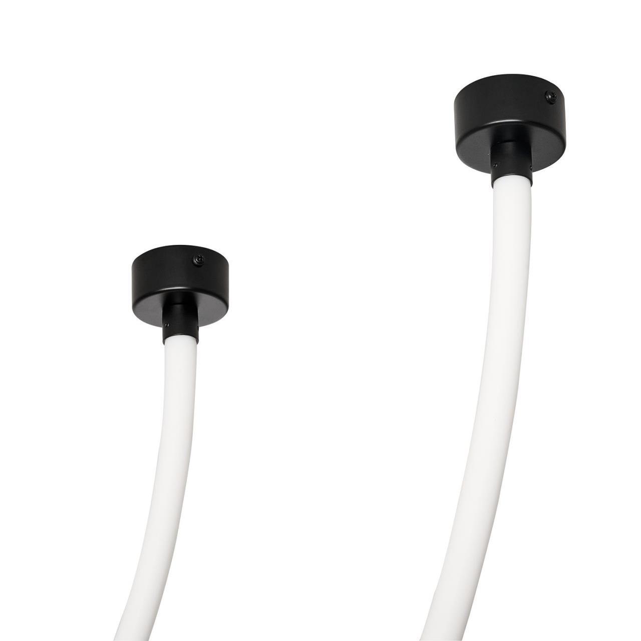 потолочный светильник, потолочное крепление из металла черного цвета, из которого выходят две длинные гибкие силиконовые трубки, выполняющие роль светового элемента, благодаря встроенному в них источнику LED. Меняя точки креплений на концах трубок можно создавать различные вариации светильника.