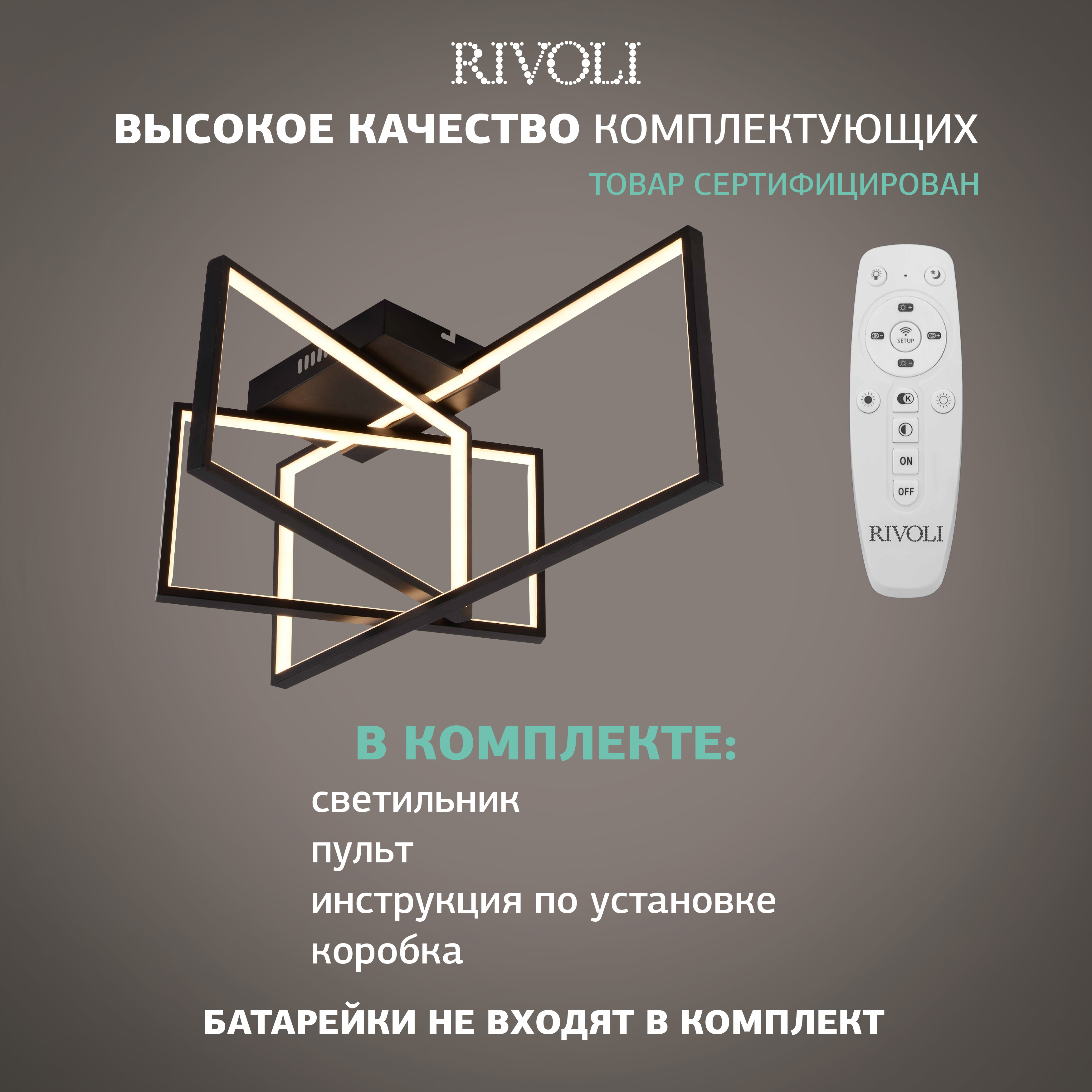 Потолочный LED-светильник Rivoli Melinda (арт. 6140-103) с регулировкой температуры и яркости свечения. Пульт управления поставляется в комплекте. Отличительная особенность — перекрещивающиеся прямоугольные плафоны. Принципиально новый дизайн светодиодных светильников на отечественном рынке. Потолочная LED-люстра на дистанционном управлении позволяет с комфортом включать и выключать освещение, регулировать яркость и цветовую температуру света. В зависимости от ситуации можно выбирать нужное освещение. Холодный свет помогает взбодриться и повысить работоспособность. Тёплый свет создаст уют и снимет напряжение глаз. Нейтральный белый свет хорош для учёбы или рукоделия. Все эти световые сценарии сосредоточены в одной люстре! Мощность LED-люстры Rivoli Melinda — 112 Вт. Качественные современные светодиоды встроены в плафоны.