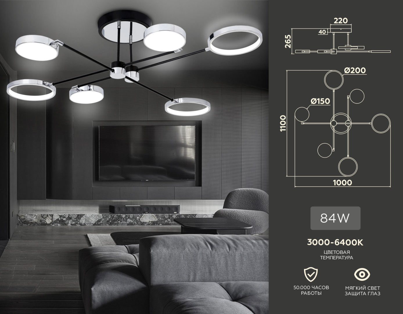 Потолочный светодиодный светильник с пультом, коллекция COMFORT. Модель FL5155 представлена в современном стиле техно. Светильник выполнен из металла в черном и цвете хром. Эта модель оснащена встроенными светодиодами, благодаря чему вы забудете о замене дополнительных ламп. Так же с помощью инфракрасного пульта вы сможете регулировать цветовую температуру и яркость освещения. Данная модель подходит для натяжных потолков и будет прекрасным дополнением в любом помещении.