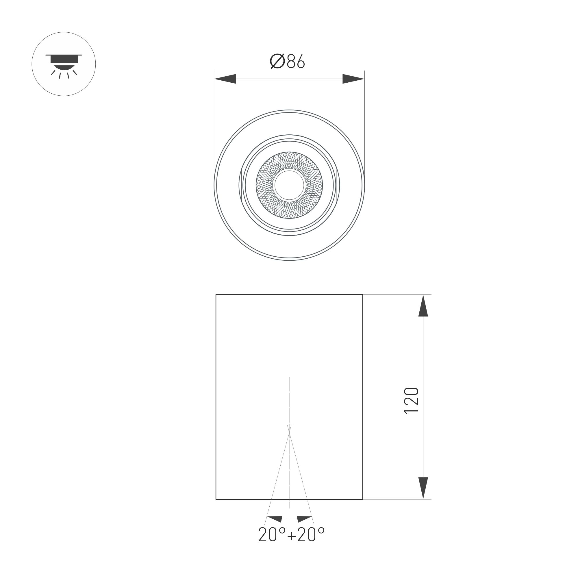 Накладной интерьерный светильник. Мощность 10 Вт, св. поток 970 лм, 93 лм/Вт, дневной 4000 K, CRI>90, угол 50°, регулируемое направление луча 40° (20+20), поворотный световой модуль вокруг своей оси на 340°, UGR <18, напряжение питания 230 В. Белый круглый корпус из алюминия, степень защиты IP54. Размер: диаметр 86,5 мм, высота 120 мм. Монтаж накладной. Драйвер 20-40 В, 250 мА, пульсация <1%.