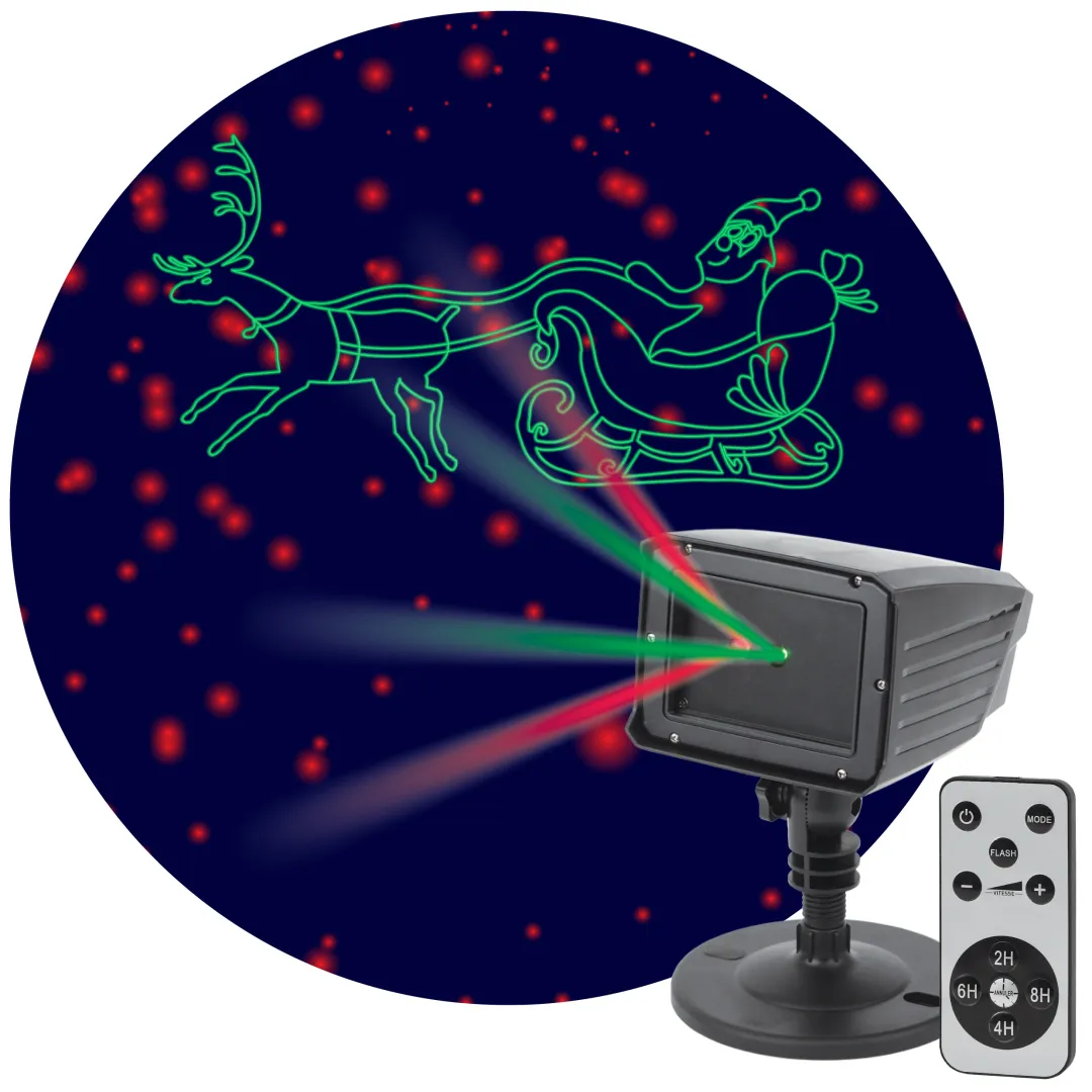 Мультирежимный лазерный новогодний проектор "Дед Мороз" (арт. Б0041643) создаёт на стенах, потолке или на фасаде здания световое изображение ключевого новогоднего персонажа - Деда Мороза. Проекция анимированная - Дед Мороз мчит на санях, запряжённых оленями. Картинка создаётся лучами двух ярких праздничных цветов - экипаж зелёного оттенка окружён красными звёздами. С помощью пульта дистанционного управления, который входит в комплект, вы можете настраивать проекцию под своё настроение: оставить полную картинку (Дед Мороз + звёзды), выбрать только сказочный экипаж (без звёзд) или включить нейтральный звёздный фон. Идеальное решение для новогодней вечеринки - режим мигания. Используйте этот практичный прибор как дома, так и на улице - он не боится осадков, пыли и мороза. В наборе 2 подставки: заострённая ножка для установки в снег или грунт + широкое основание для горизонтальной поверхности. Предусмотрены пазы для подвешивания на стену. Корпус из ударопрочного пластика. Работает прибор от стандартной сети 220 В. Шнур длиной 5 метров позволяет использовать проектор на значительном расстоянии от электросети. Специальный соединительный разъём даёт возможность дополнительно наращивать провод при помощи удлинителей. Создавайте праздничное настроение вместе с ЭРА!