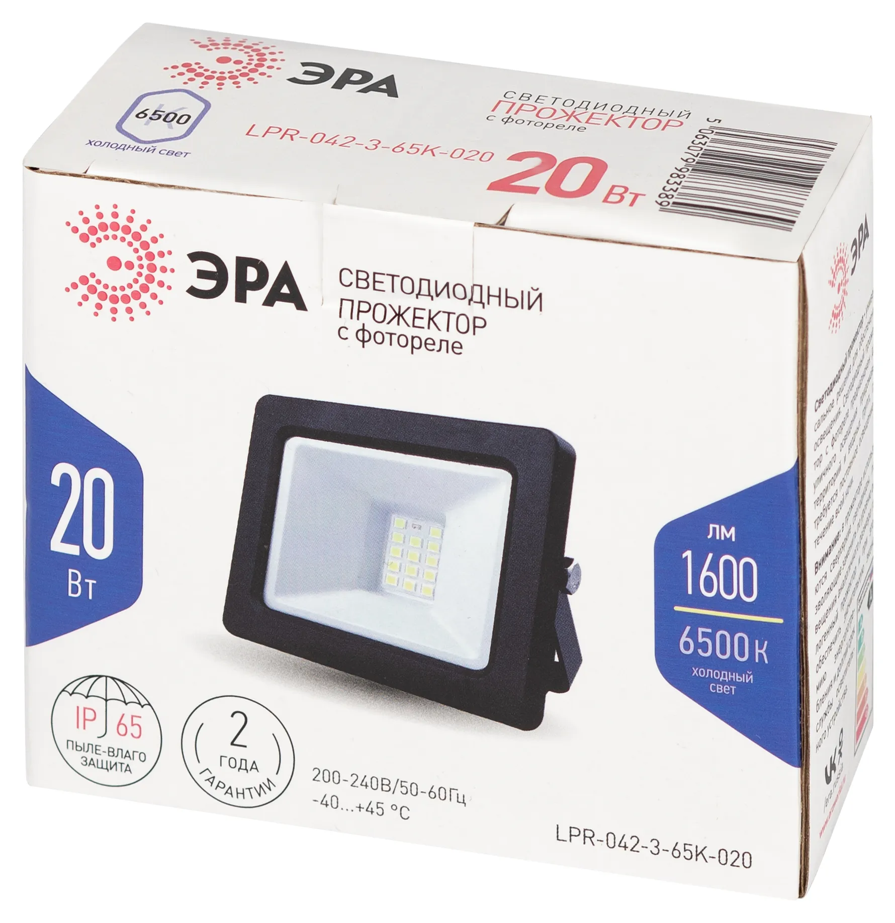 ЭРА LPR-042-3 — LED-прожектор со встроенным фотореле мощностью 20 Вт. Автоматически включаются при освещённости менее 8 лк и отключаются при освещённости более 10 лк. Удачное решение для наружного освещения открытых площадей и пространств, промышленных и складских территорий, спортивных и строительных площадок. Серия подходит для архитектурной подсветки, а также для светового оформления рекламных стендов, щитов и витрин.