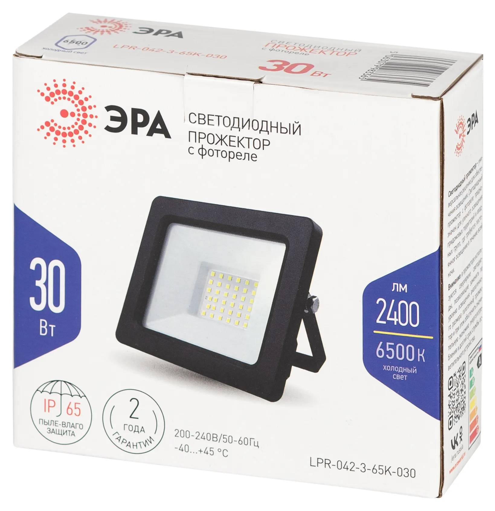 LED-прожектор со встроенным фотореле — ЭРА LPR-042-3. Автоматически включается при освещённости менее 8 лк и отключается при освещённости более 10 лк. Корпус из литого алюминия с порошковым окрашиванием, стекло закалено. Диапазон рабочих температур: от -45 до +40°C.