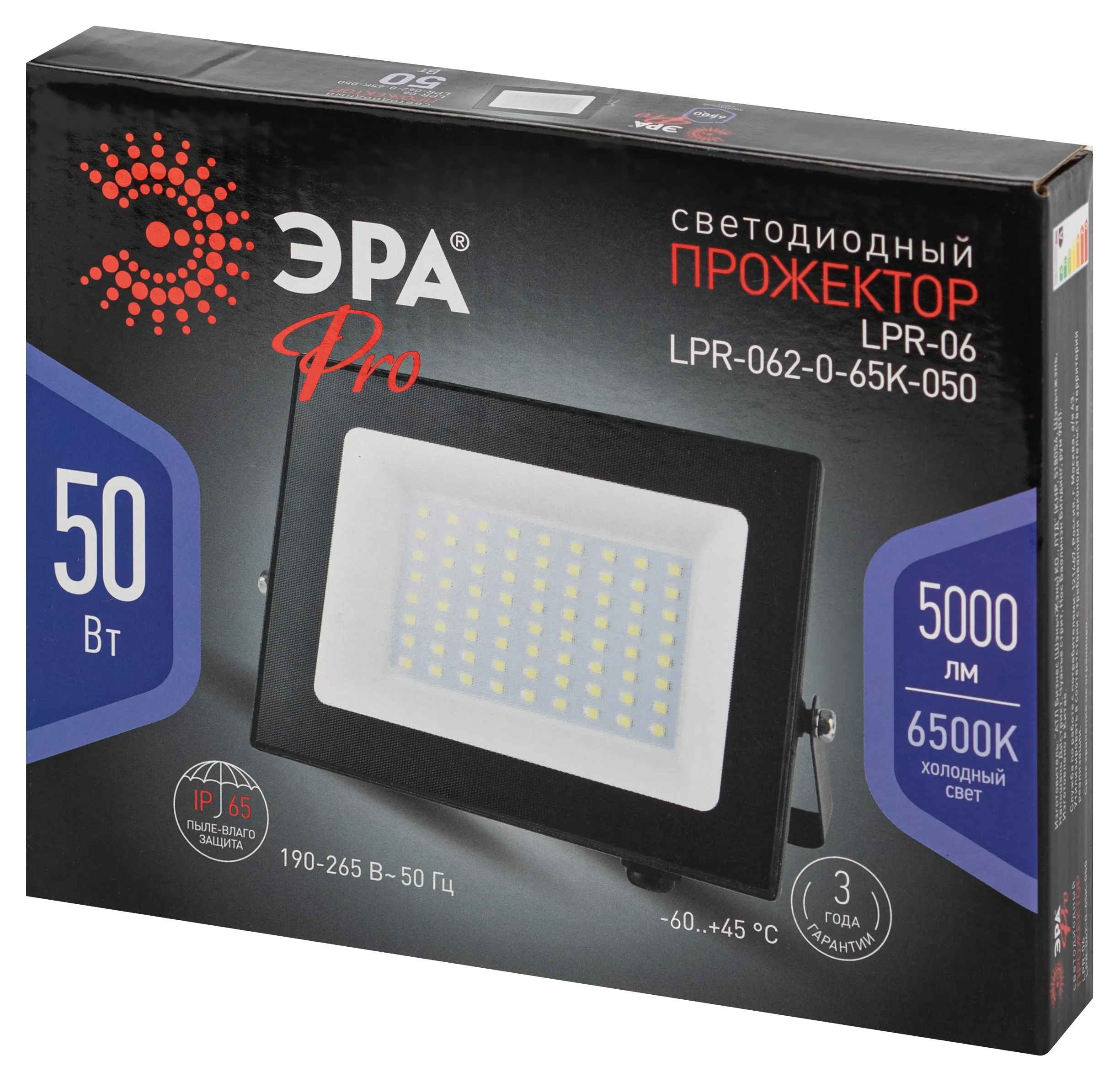Профессиональный светодиодный прожектор ЭРА PRO LPR-062 мощностью 50 Вт. Световой поток 5000 лм. Длина провода 15 см. Цветовая температура — 6500 К. Белый холодный свет — хорошее решение для освещения пространств большой площади: промышленных и складских объектов, дворовых территорий и приусадебных хозяйств, парковок, спортивных площадок.