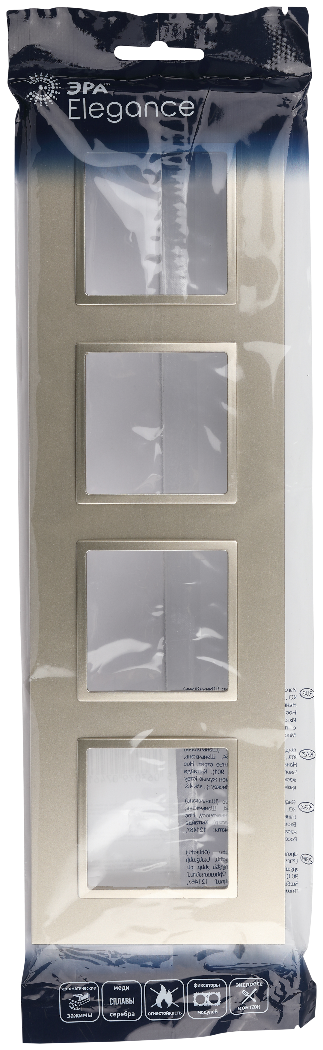 Рамка для выключателей и розеток на 4 поста серии Эра Elegance Classic цвет шампань 14-5014-04. Сделана из поликарбоната. Используется только с механизмами серии Эра Elegance.