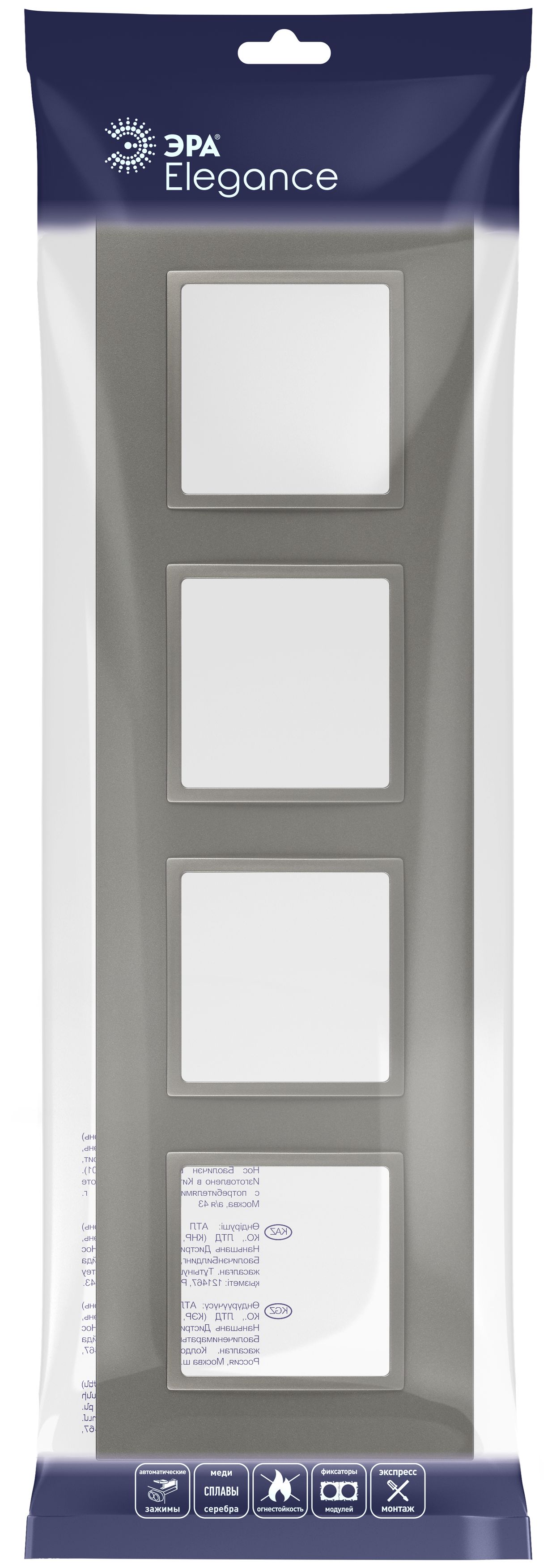 Рамка для выключателей и розеток 4-постовая серии Эра Elegance Classic цвет титан 14-5014-16. Сделана из поликарбоната. Используется только с механизмами серии Эра Elegance. Классический "квадратный" дизайн.
