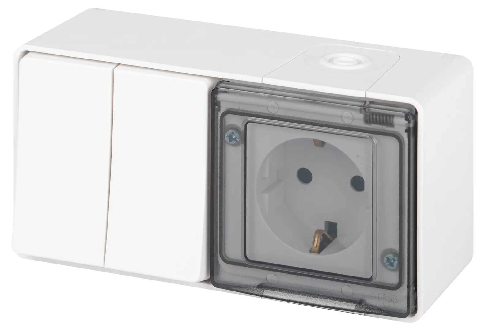 Блок розетка с выключателем влагозащищённый IP55 серии Эра Эксперт открытой установки цвет белый 11-7502-01. Номинальные характеристики 16А 250В. Устройство выполнено из качественного поликарбоната, оснащёно уникальными винтовыми клеммами ЭКСПЕРТ для максимально качественного зажима кабеля в механизме.