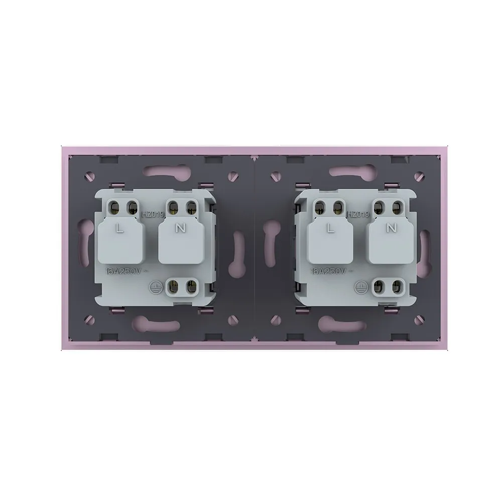 Розетка электрическая 16A Livolo на 2 поста со стеклянной рамкой LIVOLO VL-C7C2EU-17 розового цвета используется для подключения к электрической сети переменного тока 110-250 В, 50-60 Гц различных приборов и агрегатов бытового и аналогичного назначения. Активная мощность подключаемых к изделию электроприборов не должна превышать 3680 Вт. Розетка предназначена для установки в квартирах, жилых помещениях, помещениях для пребывания детей и иных аналогичных помещениях. Устанавливается в круглый подрозетник в комплекте со стеклянной рамкой (в комплекте). Эксплуатация Вставьте вилку электроприбора в розетку. Нажмите на вилку электроприбора до упора. Рабочее напряжение: 110-250 В, 50-60 Гц. Мощность нагрузки: до 3680 Вт. Избегайте использования нагрузок, превышающих номинальный выходной ток 16 А. Срок службы: >20 лет. Гарантия 12 мес. Комплектация Механизм розетки. Металлический суппорт для крепления. Стеклянная рамка. Монтаж Все работы проводить только при полном снятии напряжения cо всех токоведущих частей, находящихся в зоне работ. Неправильные установка и использование могут повлечь риск поражения электрическим током или пожара. Достаньте комплектующие из упаковки. Обязательно отключите питание перед установкой. Поместите механизм розетки в металлический суппорт. Подсоедините провода. Подключение должно выполнятся строго со схемой подключения. Затяните клеммы. Зафиксируйте механизм в подрозетнике с помощью винтов. Монтаж осуществляется в круглую монтажную коробку (подрозетник) с минимальной глубиной 40 мм. и диаметром 65-70 мм. Межцентровое расстояние для крепёжных винтов должно составлять не менее 60 мм. Установите стеклянную рамку. В комплекте. Подайте питание. Меры предосторожности Чтобы не получить травму и не повредить розетку, внимательно прочтите все инструкции. Не устанавливайте изделие вблизи источников огня и воды. Неправильное использование изделия может легко привести к его повреждению или поставить под угрозу личную безопасность и безопасность имущества. Потребитель несет ответственность за любой личный и имущественный ущерб, возникший в результате неправильного использования продукта в соответствии с руководством пользователя. Категорически запрещается разбирать розетку, вносить изменения в конструкцию. Избегайте использования нагрузок, превышающих номинальный выходной ток розетки. Следует избегать интенсивных физических действий, включая стуки, бросания, топтание, сдавливание и т. д. При включении и выключении приборов, вилку необходимо держать за пластмассовую часть, а не за провод.