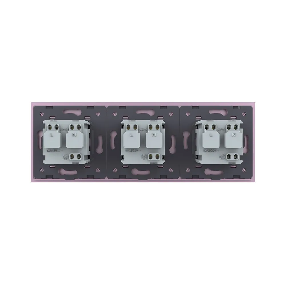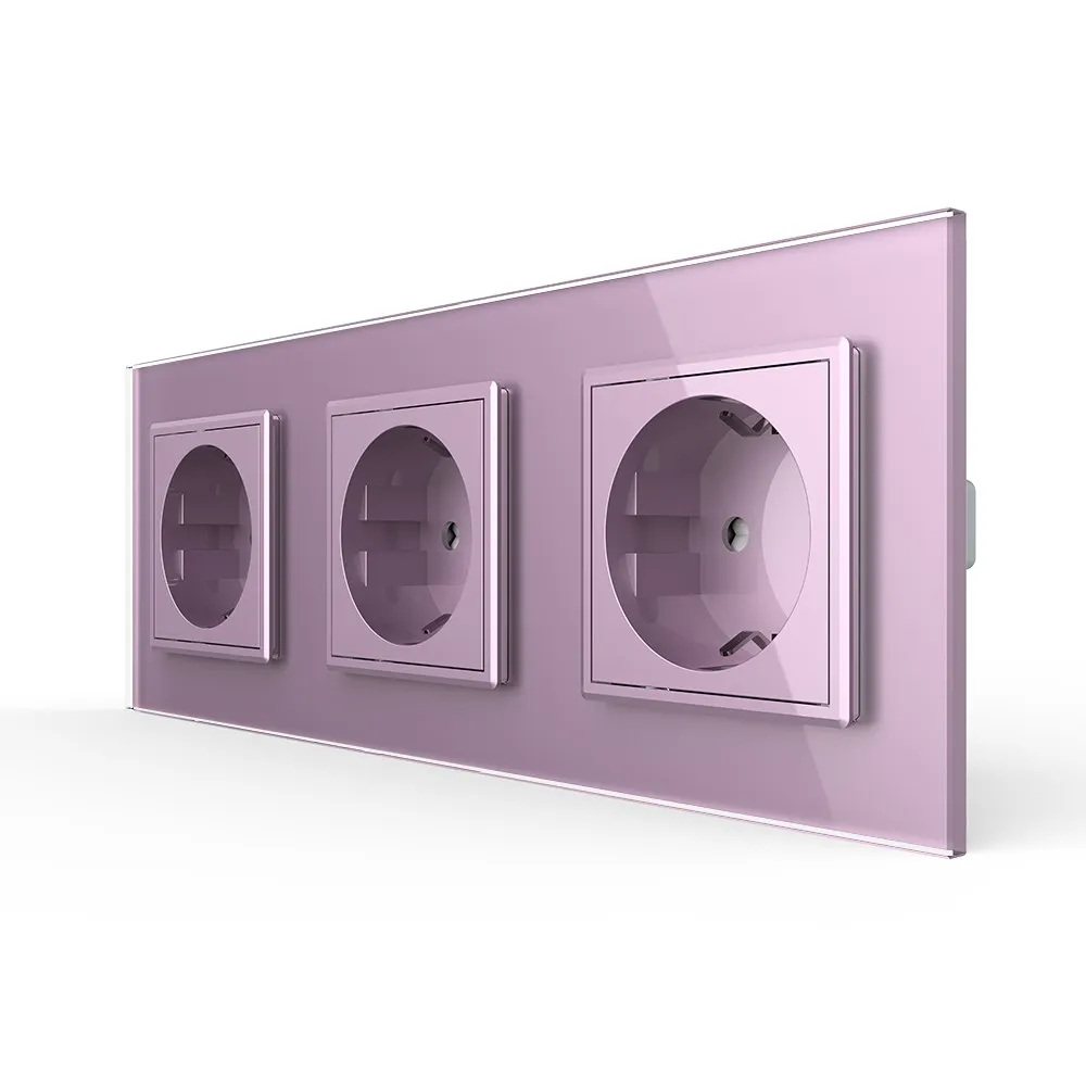 Розетка электрическая 16A Livolo на 3 поста со стеклянной рамкой LIVOLO VL-C7C3EU-17 розового цвета используется для подключения к электрической сети переменного тока 110-250 В, 50-60 Гц различных приборов и агрегатов бытового и аналогичного назначения. Активная мощность подключаемых к изделию электроприборов не должна превышать 3680 Вт. Розетка предназначена для установки в квартирах, жилых помещениях, помещениях для пребывания детей и иных аналогичных помещениях. Устанавливается в круглый подрозетник в комплекте со стеклянной рамкой (в комплекте). Эксплуатация Вставьте вилку электроприбора в розетку. Нажмите на вилку электроприбора до упора. Рабочее напряжение: 110-250 В, 50-60 Гц. Мощность нагрузки: до 3680 Вт. Избегайте использования нагрузок, превышающих номинальный выходной ток 16 А. Срок службы: >20 лет. Гарантия 12 мес. Комплектация Механизм розетки. Металлический суппорт для крепления. Стеклянная рамка. Монтаж Все работы проводить только при полном снятии напряжения cо всех токоведущих частей, находящихся в зоне работ. Неправильные установка и использование могут повлечь риск поражения электрическим током или пожара. Достаньте комплектующие из упаковки. Обязательно отключите питание перед установкой. Поместите механизм розетки в металлический суппорт. Подсоедините провода. Подключение должно выполнятся строго со схемой подключения. Затяните клеммы. Зафиксируйте механизм в подрозетнике с помощью винтов. Монтаж осуществляется в круглую монтажную коробку (подрозетник) с минимальной глубиной 40 мм. и диаметром 65-70 мм. Межцентровое расстояние для крепёжных винтов должно составлять не менее 60 мм. Установите стеклянную рамку. В комплекте. Подайте питание. Меры предосторожности Чтобы не получить травму и не повредить розетку, внимательно прочтите все инструкции. Не устанавливайте изделие вблизи источников огня и воды. Неправильное использование изделия может легко привести к его повреждению или поставить под угрозу личную безопасность и безопасность имущества. Потребитель несет ответственность за любой личный и имущественный ущерб, возникший в результате неправильного использования продукта в соответствии с руководством пользователя. Категорически запрещается разбирать розетку, вносить изменения в конструкцию. Избегайте использования нагрузок, превышающих номинальный выходной ток розетки. Следует избегать интенсивных физических действий, включая стуки, бросания, топтание, сдавливание и т. д. При включении и выключении приборов, вилку необходимо держать за пластмассовую часть, а не за провод.