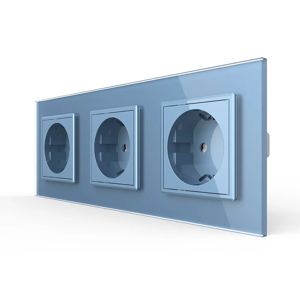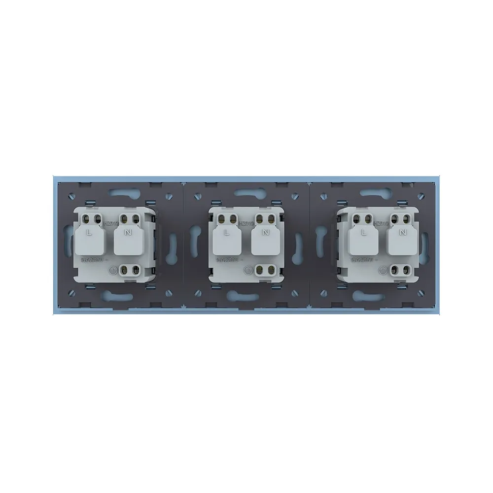Розетка электрическая 16A Livolo на 3 поста со стеклянной рамкой LIVOLO VL-C7C3EU-19 синего цвета используется для подключения к электрической сети переменного тока 110-250 В, 50-60 Гц различных приборов и агрегатов бытового и аналогичного назначения. Активная мощность подключаемых к изделию электроприборов не должна превышать 3680 Вт. Розетка предназначена для установки в квартирах, жилых помещениях, помещениях для пребывания детей и иных аналогичных помещениях. Устанавливается в круглый подрозетник в комплекте со стеклянной рамкой (в комплекте). Эксплуатация Вставьте вилку электроприбора в розетку. Нажмите на вилку электроприбора до упора. Рабочее напряжение: 110-250 В, 50-60 Гц. Мощность нагрузки: до 3680 Вт. Избегайте использования нагрузок, превышающих номинальный выходной ток 16 А. Срок службы: >20 лет. Гарантия 12 мес. Комплектация Механизм розетки. Металлический суппорт для крепления. Стеклянная рамка. Монтаж Все работы проводить только при полном снятии напряжения cо всех токоведущих частей, находящихся в зоне работ. Неправильные установка и использование могут повлечь риск поражения электрическим током или пожара. Достаньте комплектующие из упаковки. Обязательно отключите питание перед установкой. Поместите механизм розетки в металлический суппорт. Подсоедините провода. Подключение должно выполнятся строго со схемой подключения. Затяните клеммы. Зафиксируйте механизм в подрозетнике с помощью винтов. Монтаж осуществляется в круглую монтажную коробку (подрозетник) с минимальной глубиной 40 мм. и диаметром 65-70 мм. Межцентровое расстояние для крепёжных винтов должно составлять не менее 60 мм. Установите стеклянную рамку. В комплекте. Подайте питание. Меры предосторожности Чтобы не получить травму и не повредить розетку, внимательно прочтите все инструкции. Не устанавливайте изделие вблизи источников огня и воды. Неправильное использование изделия может легко привести к его повреждению или поставить под угрозу личную безопасность и безопасность имущества. Потребитель несет ответственность за любой личный и имущественный ущерб, возникший в результате неправильного использования продукта в соответствии с руководством пользователя. Категорически запрещается разбирать розетку, вносить изменения в конструкцию. Избегайте использования нагрузок, превышающих номинальный выходной ток розетки. Следует избегать интенсивных физических действий, включая стуки, бросания, топтание, сдавливание и т. д. При включении и выключении приборов, вилку необходимо держать за пластмассовую часть, а не за провод.