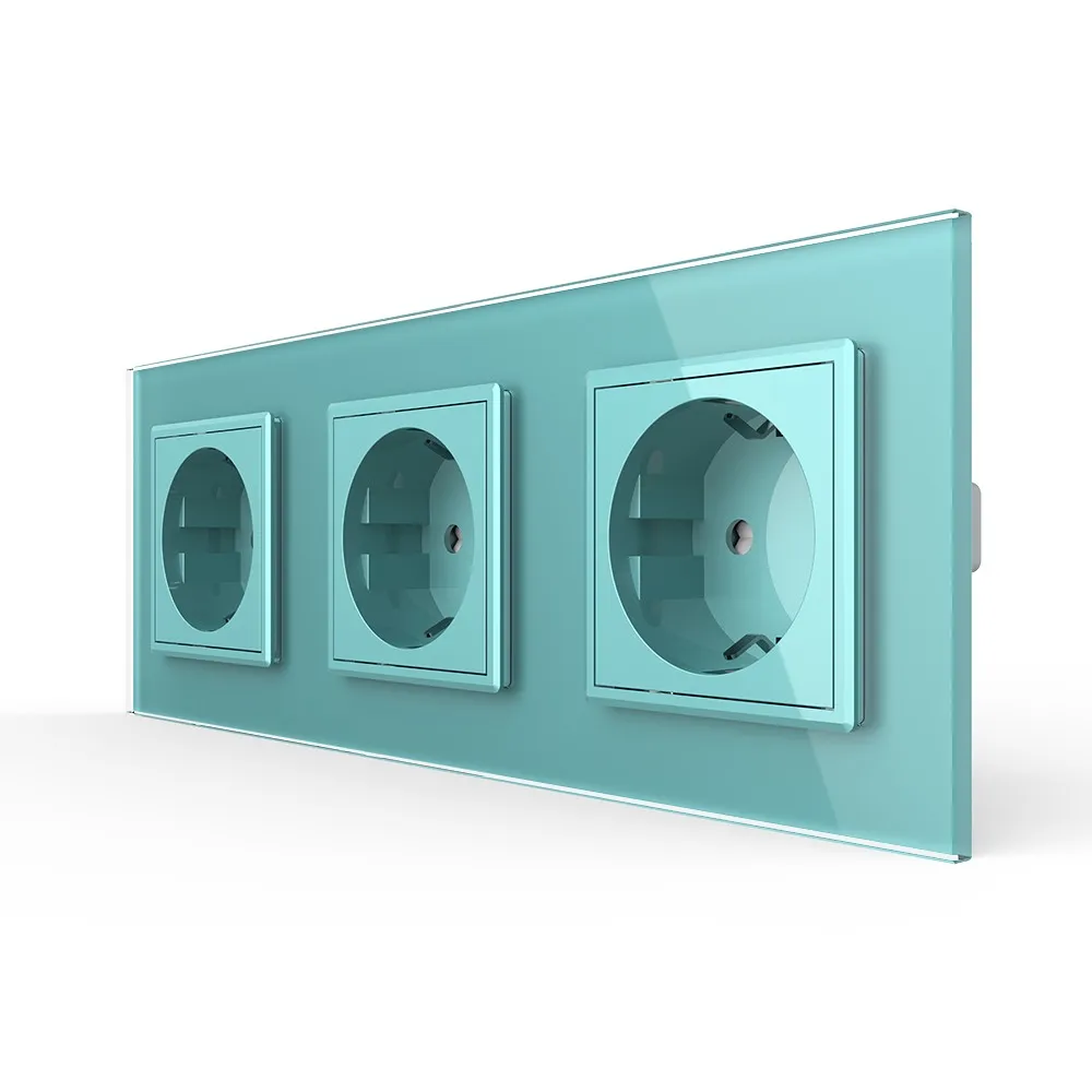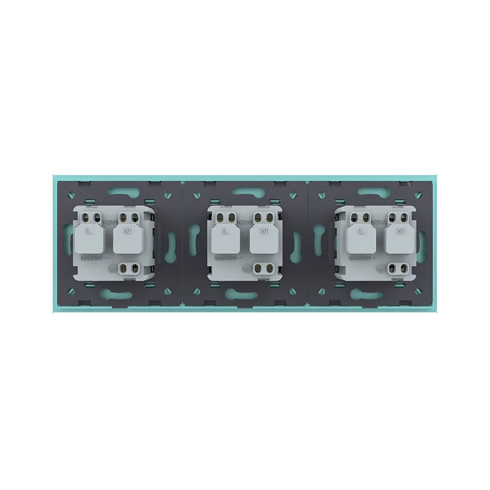 Розетка электрическая 16A Livolo на 3 поста со стеклянной рамкой LIVOLO VL-C7C3EU-18 зеленого цвета используется для подключения к электрической сети переменного тока 110-250 В, 50-60 Гц различных приборов и агрегатов бытового и аналогичного назначения. Активная мощность подключаемых к изделию электроприборов не должна превышать 3680 Вт. Розетка предназначена для установки в квартирах, жилых помещениях, помещениях для пребывания детей и иных аналогичных помещениях. Устанавливается в круглый подрозетник в комплекте со стеклянной рамкой (в комплекте). Эксплуатация Вставьте вилку электроприбора в розетку. Нажмите на вилку электроприбора до упора. Рабочее напряжение: 110-250 В, 50-60 Гц. Мощность нагрузки: до 3680 Вт. Избегайте использования нагрузок, превышающих номинальный выходной ток 16 А. Срок службы: >20 лет. Гарантия 12 мес. Комплектация Механизм розетки. Металлический суппорт для крепления. Стеклянная рамка. Монтаж Все работы проводить только при полном снятии напряжения cо всех токоведущих частей, находящихся в зоне работ. Неправильные установка и использование могут повлечь риск поражения электрическим током или пожара. Достаньте комплектующие из упаковки. Обязательно отключите питание перед установкой. Поместите механизм розетки в металлический суппорт. Подсоедините провода. Подключение должно выполнятся строго со схемой подключения. Затяните клеммы. Зафиксируйте механизм в подрозетнике с помощью винтов. Монтаж осуществляется в круглую монтажную коробку (подрозетник) с минимальной глубиной 40 мм. и диаметром 65-70 мм. Межцентровое расстояние для крепёжных винтов должно составлять не менее 60 мм. Установите стеклянную рамку. В комплекте. Подайте питание. Меры предосторожности Чтобы не получить травму и не повредить розетку, внимательно прочтите все инструкции. Не устанавливайте изделие вблизи источников огня и воды. Неправильное использование изделия может легко привести к его повреждению или поставить под угрозу личную безопасность и безопасность имущества. Потребитель несет ответственность за любой личный и имущественный ущерб, возникший в результате неправильного использования продукта в соответствии с руководством пользователя. Категорически запрещается разбирать розетку, вносить изменения в конструкцию. Избегайте использования нагрузок, превышающих номинальный выходной ток розетки. Следует избегать интенсивных физических действий, включая стуки, бросания, топтание, сдавливание и т. д. При включении и выключении приборов, вилку необходимо держать за пластмассовую часть, а не за провод.