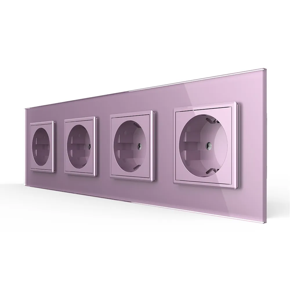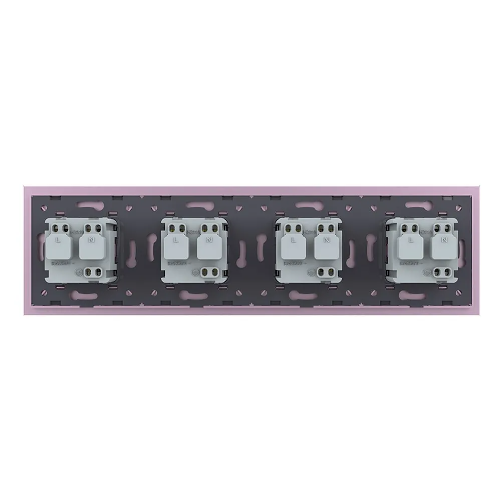 Розетка электрическая 16A Livolo на 4 поста со стеклянной рамкой LIVOLO VL-C7C4EU-17 розового цвета используется для подключения к электрической сети переменного тока 110-250 В, 50-60 Гц различных приборов и агрегатов бытового и аналогичного назначения. Активная мощность подключаемых к изделию электроприборов не должна превышать 3680 Вт. Розетка предназначена для установки в квартирах, жилых помещениях, помещениях для пребывания детей и иных аналогичных помещениях. Устанавливается в круглый подрозетник в комплекте со стеклянной рамкой (в комплекте). Эксплуатация Вставьте вилку электроприбора в розетку. Нажмите на вилку электроприбора до упора. Рабочее напряжение: 110-250 В, 50-60 Гц. Мощность нагрузки: до 3680 Вт. Избегайте использования нагрузок, превышающих номинальный выходной ток 16 А. Срок службы: >20 лет. Гарантия 12 мес. Комплектация Механизм розетки. Металлический суппорт для крепления. Стеклянная рамка. Монтаж Все работы проводить только при полном снятии напряжения cо всех токоведущих частей, находящихся в зоне работ. Неправильные установка и использование могут повлечь риск поражения электрическим током или пожара. Достаньте комплектующие из упаковки. Обязательно отключите питание перед установкой. Поместите механизм розетки в металлический суппорт. Подсоедините провода. Подключение должно выполнятся строго со схемой подключения. Затяните клеммы. Зафиксируйте механизм в подрозетнике с помощью винтов. Монтаж осуществляется в круглую монтажную коробку (подрозетник) с минимальной глубиной 40 мм. и диаметром 65-70 мм. Межцентровое расстояние для крепёжных винтов должно составлять не менее 60 мм. Установите стеклянную рамку. В комплекте. Подайте питание. Меры предосторожности Чтобы не получить травму и не повредить розетку, внимательно прочтите все инструкции. Не устанавливайте изделие вблизи источников огня и воды. Неправильное использование изделия может легко привести к его повреждению или поставить под угрозу личную безопасность и безопасность имущества. Потребитель несет ответственность за любой личный и имущественный ущерб, возникший в результате неправильного использования продукта в соответствии с руководством пользователя. Категорически запрещается разбирать розетку, вносить изменения в конструкцию. Избегайте использования нагрузок, превышающих номинальный выходной ток розетки. Следует избегать интенсивных физических действий, включая стуки, бросания, топтание, сдавливание и т. д. При включении и выключении приборов, вилку необходимо держать за пластмассовую часть, а не за провод.