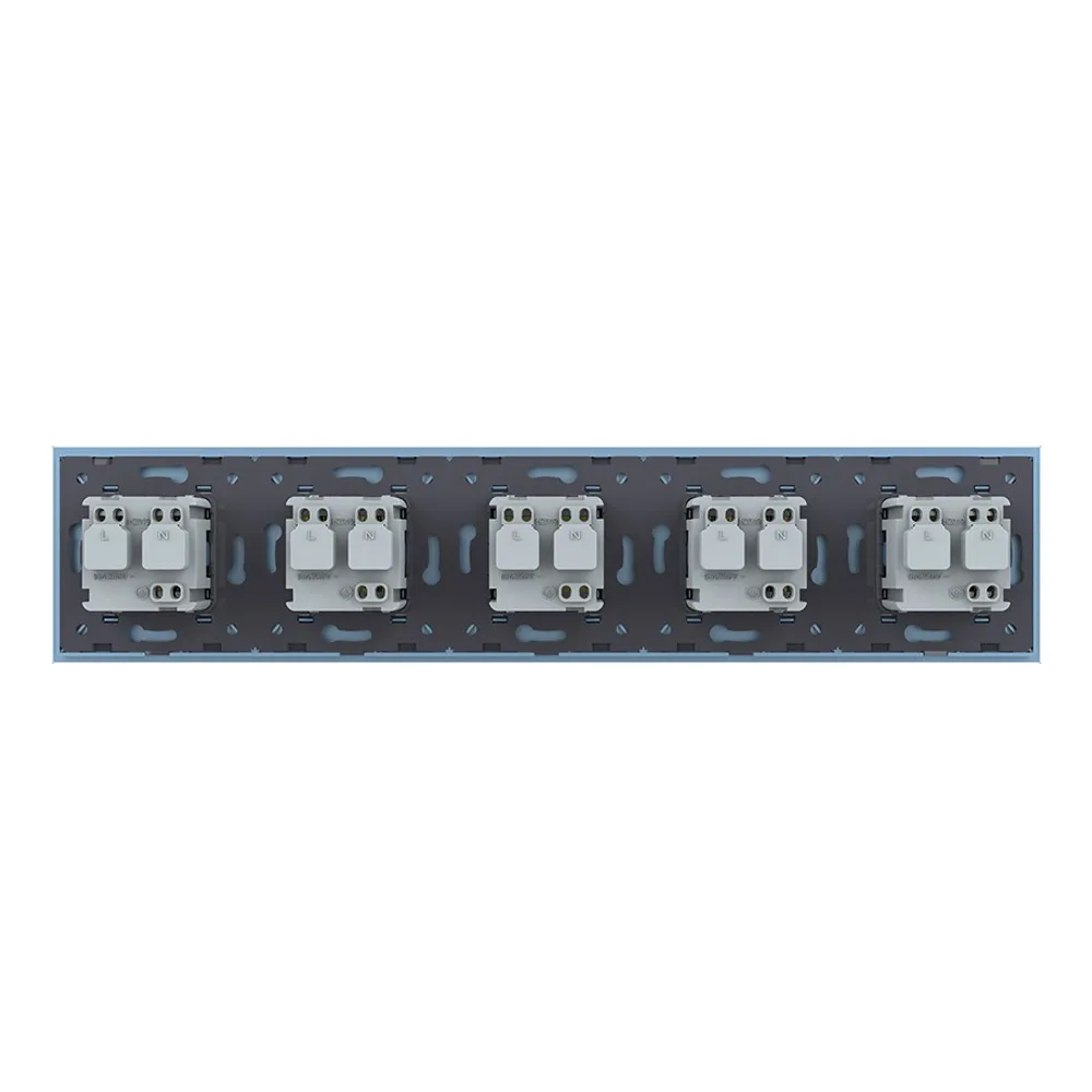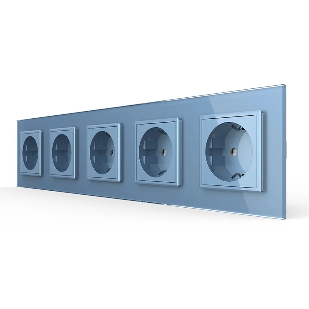 Розетка электрическая 16A Livolo на 5 постов со стеклянной рамкой LIVOLO VL-C7C5EU-19 синего цвета используется для подключения к электрической сети переменного тока 110-250 В, 50-60 Гц различных приборов и агрегатов бытового и аналогичного назначения. Активная мощность подключаемых к изделию электроприборов не должна превышать 3680 Вт. Розетка предназначена для установки в квартирах, жилых помещениях, помещениях для пребывания детей и иных аналогичных помещениях. Устанавливается в круглый подрозетник в комплекте со стеклянной рамкой (в комплекте). Эксплуатация Вставьте вилку электроприбора в розетку. Нажмите на вилку электроприбора до упора. Рабочее напряжение: 110-250 В, 50-60 Гц. Мощность нагрузки: до 3680 Вт. Избегайте использования нагрузок, превышающих номинальный выходной ток 16 А. Срок службы: >20 лет. Гарантия 12 мес. Комплектация Механизм розетки. Металлический суппорт для крепления. Стеклянная рамка. Монтаж Все работы проводить только при полном снятии напряжения cо всех токоведущих частей, находящихся в зоне работ. Неправильные установка и использование могут повлечь риск поражения электрическим током или пожара. Достаньте комплектующие из упаковки. Обязательно отключите питание перед установкой. Поместите механизм розетки в металлический суппорт. Подсоедините провода. Подключение должно выполнятся строго со схемой подключения. Затяните клеммы. Зафиксируйте механизм в подрозетнике с помощью винтов. Монтаж осуществляется в круглую монтажную коробку (подрозетник) с минимальной глубиной 40 мм. и диаметром 65-70 мм. Межцентровое расстояние для крепёжных винтов должно составлять не менее 60 мм. Установите стеклянную рамку. В комплекте. Подайте питание. Меры предосторожности Чтобы не получить травму и не повредить розетку, внимательно прочтите все инструкции. Не устанавливайте изделие вблизи источников огня и воды. Неправильное использование изделия может легко привести к его повреждению или поставить под угрозу личную безопасность и безопасность имущества. Потребитель несет ответственность за любой личный и имущественный ущерб, возникший в результате неправильного использования продукта в соответствии с руководством пользователя. Категорически запрещается разбирать розетку, вносить изменения в конструкцию. Избегайте использования нагрузок, превышающих номинальный выходной ток розетки. Следует избегать интенсивных физических действий, включая стуки, бросания, топтание, сдавливание и т. д. При включении и выключении приборов, вилку необходимо держать за пластмассовую часть, а не за провод.