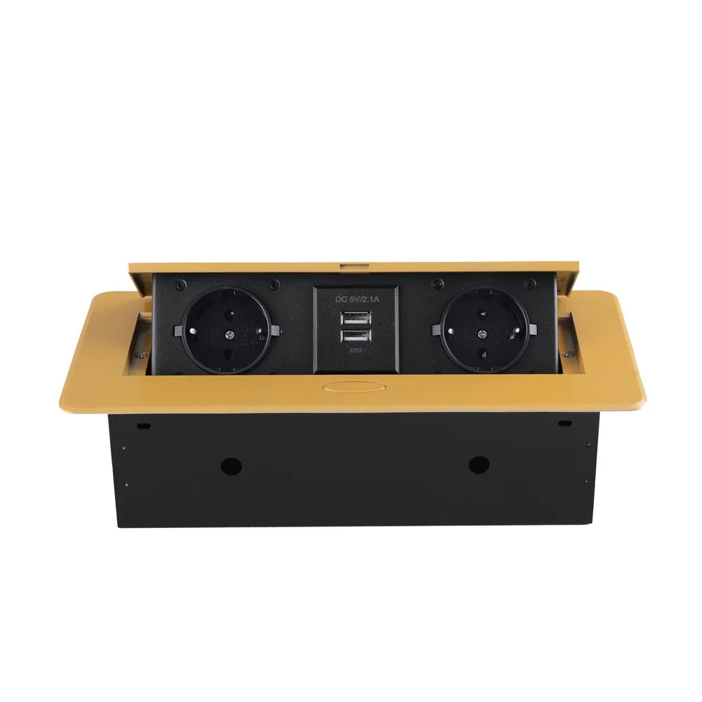 Розетка горизонтальная выдвижная 2 Euro 16A, 2 USB A с блоком 5В/2.1А RocketSocket SHS018-G золотого цвета используется для подключения к электрической сети переменного тока 110-250 В, 50-60 Гц различных приборов и агрегатов бытового и аналогичного назначения. Встроенные USB-разъемы удобны для подзарядки мобильных телефонов, планшетов, для питания MP3 плееров и других портативных электронных устройств.