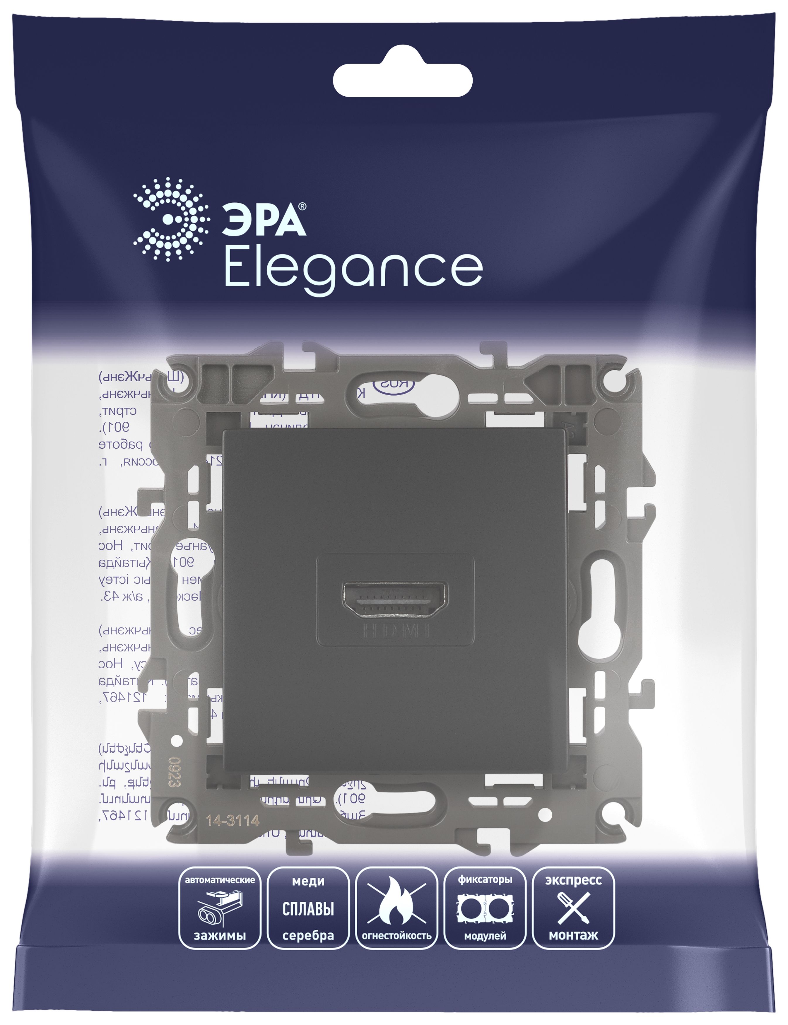 Розетка HDMI серии Эра Elegance цвет антрацит 14-3114-05. Рамки приобретаются отдельно. Рамки Эра Elegance ПЛАСТИК: 1 пост 14-5001-хх, 2 поста 14-5002-хх, 3 поста 14-5003-хх, 4 поста 14-5004-хх, 5 постов 14-5005-хх; СТЕКЛО: 1 пост 14-5101-хх, 2 поста 14-5102-хх, 3 поста 14-5103-хх, 4 поста 14-5104-хх; МЕТАЛЛ: 1 пост 14-5201-хх, 2 поста 14-5202-хх, 3 поста 14-5203-хх, 4 поста 14-5204-хх; ДЕРЕВО: 1 пост 14-5301-хх, 2 поста 14-5302-хх, 3 поста 14-5303-хх, 4 поста 14-5304-хх (хх - код цвета: 00-прозрачный, 01-белый, белёный дуб, 02-слоновая кость, 03-алюминий, 04-шампань, 05-чёрный, чёрное дерево, 07-ясень, 09-дуб, 10-венге, 11-клён, 14-медь, 21-жёлтый, 22-оранжевый, 23-красный, 25-бордо, 26-лайм, 27-зелёный, 28-голубой, 29-синий, 30-розовый, 31-мокко, 32-серый, 41-сталь, 42-титан).