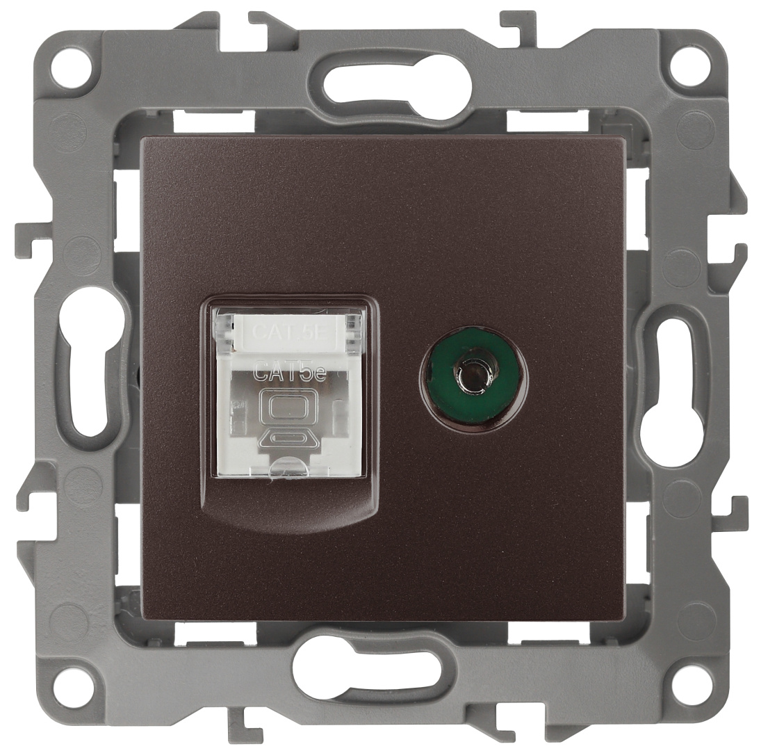Розетка телевизионная + интернет серии Эра 12 скрытой установки механизм цвет бронза 12-3110-13. Сделана из поликарбоната. Монтаж в подрозетник производится и на лапки, и на винты. Рамки приобретаются отдельно.