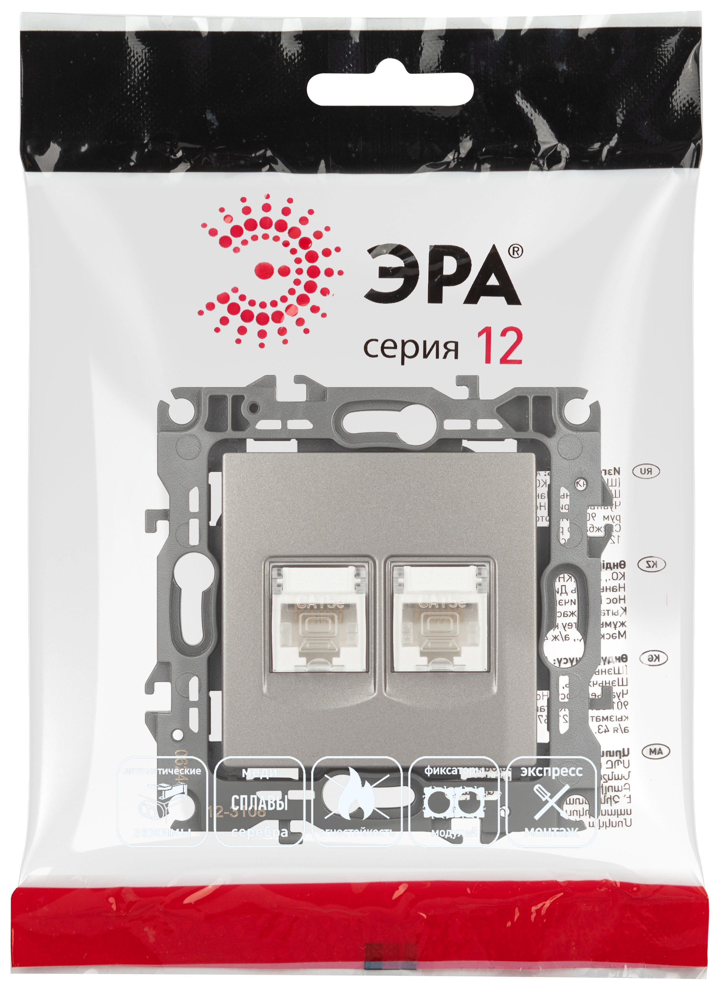 Розетка информационная двойная 2хRJ45 серии Эра 12 скрытой установки механизм цвет титан 12-3108-16. Сделана из поликарбоната. Монтаж в подрозетник производится и на лапки, и на винты. Рамки приобретаются отдельно.