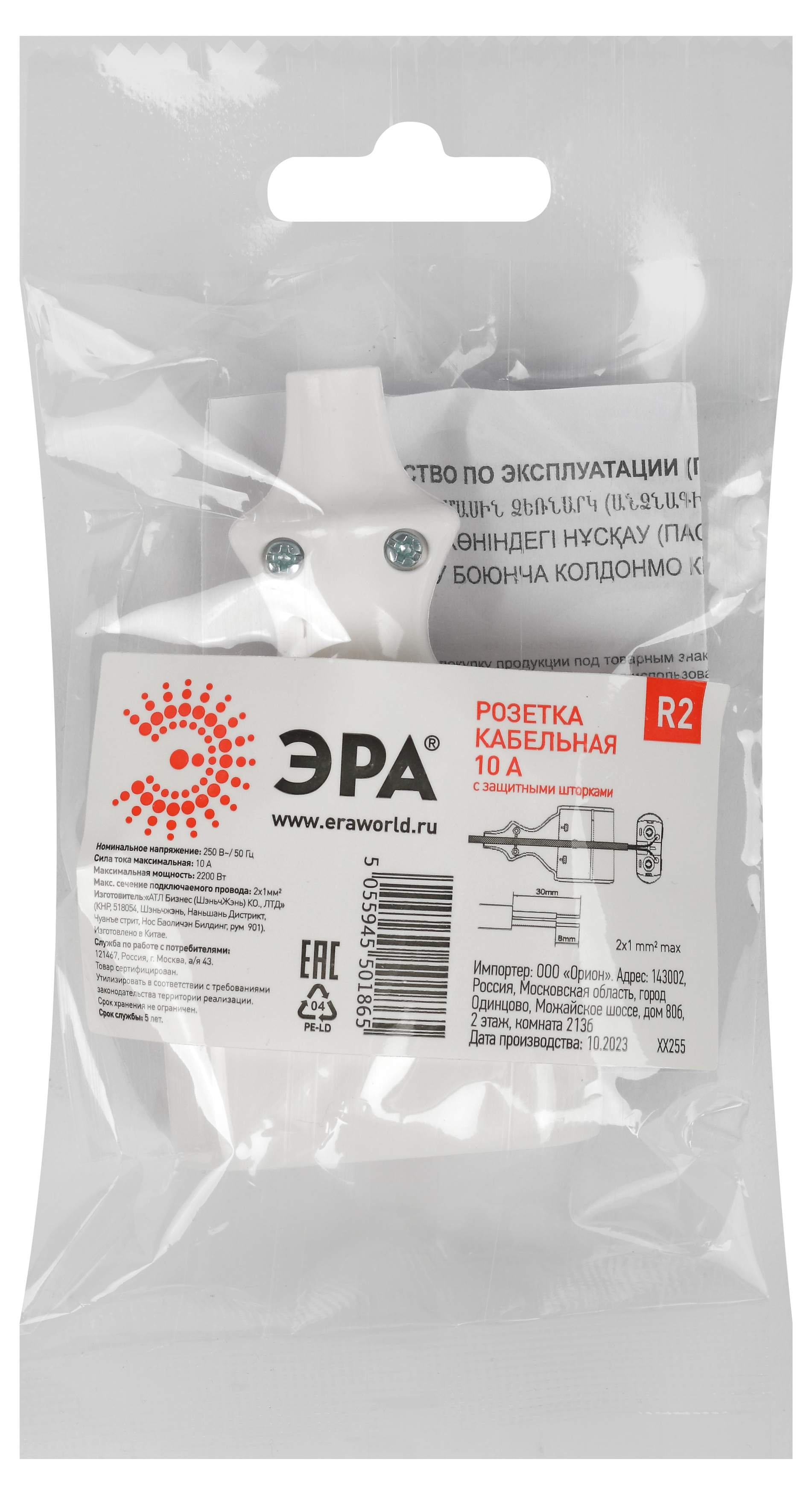 Розетка штепсельная ЭРА, максимальная мощность - 10A/2200В (кабель до 2x1мм2), поликарбонат