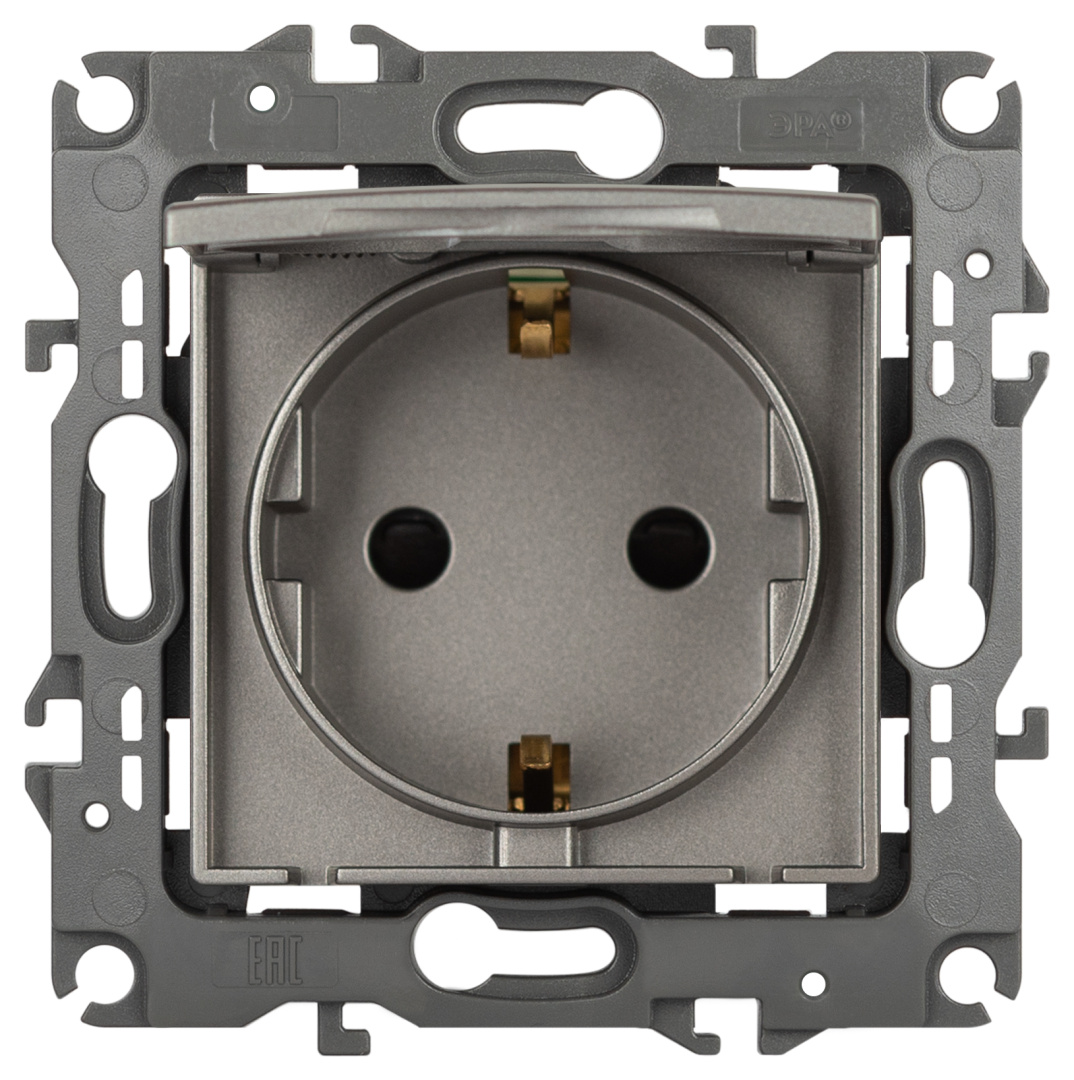 Розетка с заземлением со шторками с крышкой серии Эра 12 скрытой установки механизм цвет титан 12-2103-16. Номинальные хар-ки 16А 250В. Сделана из поликарбоната, оснащена автоматическими клеммами для быстрой и надёжной фиксации жил кабеля в механизме. Парные клеммы обеспечивают соединение шлейфом. Монтаж в подрозетник производится и на лапки, и на винты.
