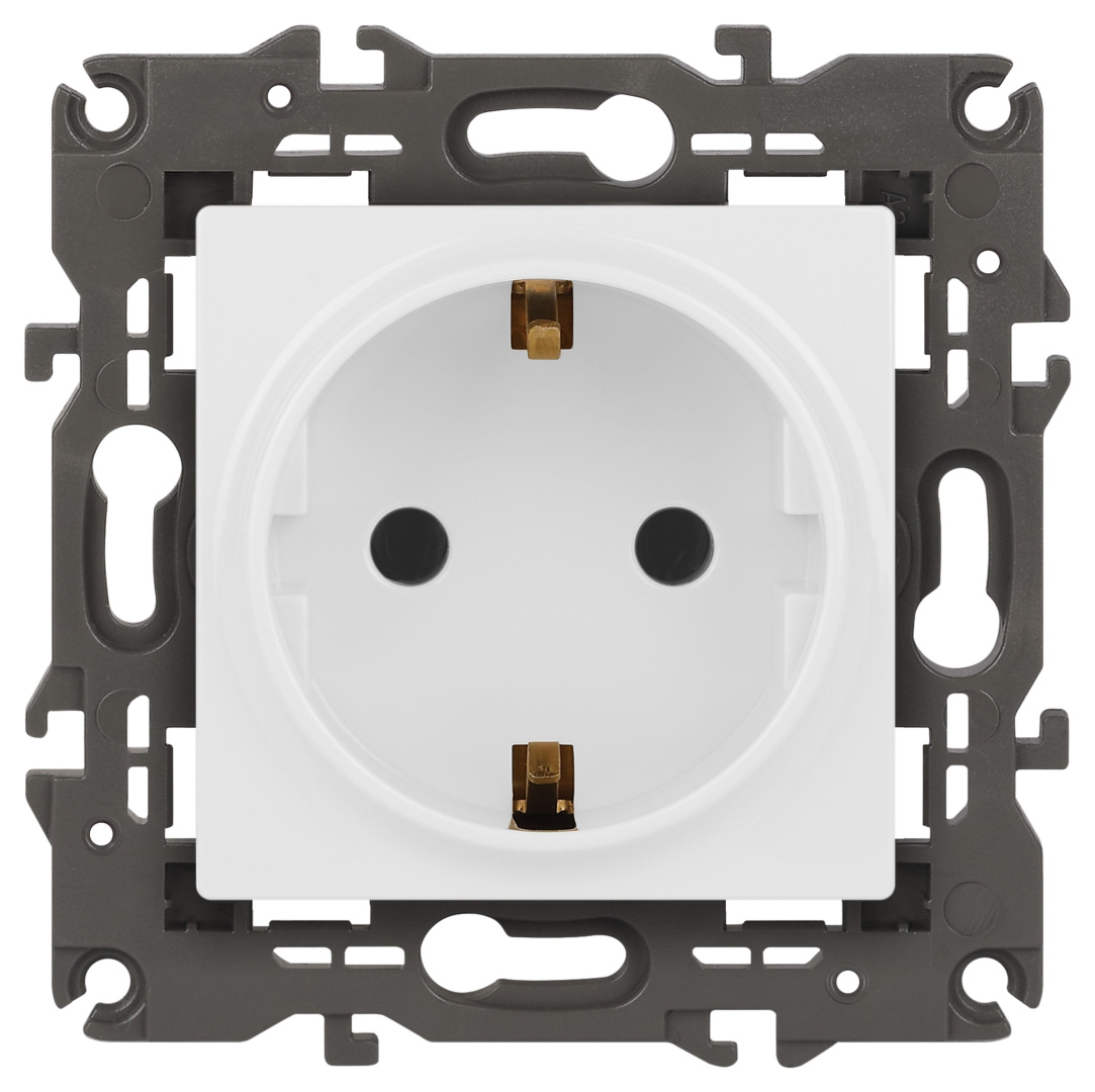 Розетка с заземлением Эра Elegance белый 14-2101-01. Оснащёна автоматическими клеммами для надёжной фиксации жил кабеля в механизме. Рамки приобретаются отдельно. Рамки Эра Elegance ПЛАСТИК: 1 пост 14-5001-хх, 2 поста 14-5002-хх, 3 поста 14-5003-хх, 4 поста 14-5004-хх, 5 постов 14-5005-хх; СТЕКЛО: 1 пост 14-5101-хх, 2 поста 14-5102-хх, 3 поста 14-5103-хх, 4 поста 14-5104-хх; МЕТАЛЛ: 1 пост 14-5201-хх, 2 поста 14-5202-хх, 3 поста 14-5203-хх, 4 поста 14-5204-хх; ДЕРЕВО: 1 пост 14-5301-хх, 2 поста 14-5302-хх, 3 поста 14-5303-хх, 4 поста 14-5304-хх (хх - код цвета: 00-прозрачный, 01-белый, белёный дуб, 02-слоновая кость, 03-алюминий, 04-шампань, 05-чёрный, чёрное дерево, 07-ясень, 09-дуб, 10-венге, 11-клён, 14-медь, 21-жёлтый, 22-оранжевый, 23-красный, 25-бордо, 26-лайм, 27-зелёный, 28-голубой, 29-синий, 30-розовый, 31-мокко, 32-серый, 41-сталь, 42-титан).