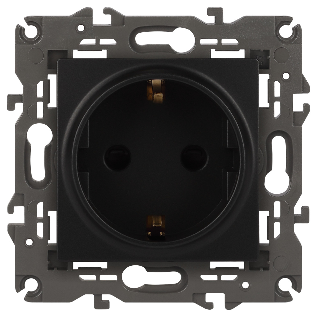 Розетка с заземлением Эра Elegance антрацит 14-2101-05. Оснащёна автоматическими клеммами для надёжной фиксации жил кабеля в механизме. Рамки приобретаются отдельно. Рамки Эра Elegance ПЛАСТИК: 1 пост 14-5001-хх, 2 поста 14-5002-хх, 3 поста 14-5003-хх, 4 поста 14-5004-хх, 5 постов 14-5005-хх; СТЕКЛО: 1 пост 14-5101-хх, 2 поста 14-5102-хх, 3 поста 14-5103-хх, 4 поста 14-5104-хх; МЕТАЛЛ: 1 пост 14-5201-хх, 2 поста 14-5202-хх, 3 поста 14-5203-хх, 4 поста 14-5204-хх; ДЕРЕВО: 1 пост 14-5301-хх, 2 поста 14-5302-хх, 3 поста 14-5303-хх, 4 поста 14-5304-хх (хх - код цвета: 00-прозрачный, 01-белый, белёный дуб, 02-слоновая кость, 03-алюминий, 04-шампань, 05-чёрный, чёрное дерево, 07-ясень, 09-дуб, 10-венге, 11-клён, 14-медь, 21-жёлтый, 22-оранжевый, 23-красный, 25-бордо, 26-лайм, 27-зелёный, 28-голубой, 29-синий, 30-розовый, 31-мокко, 32-серый, 41-сталь, 42-титан).