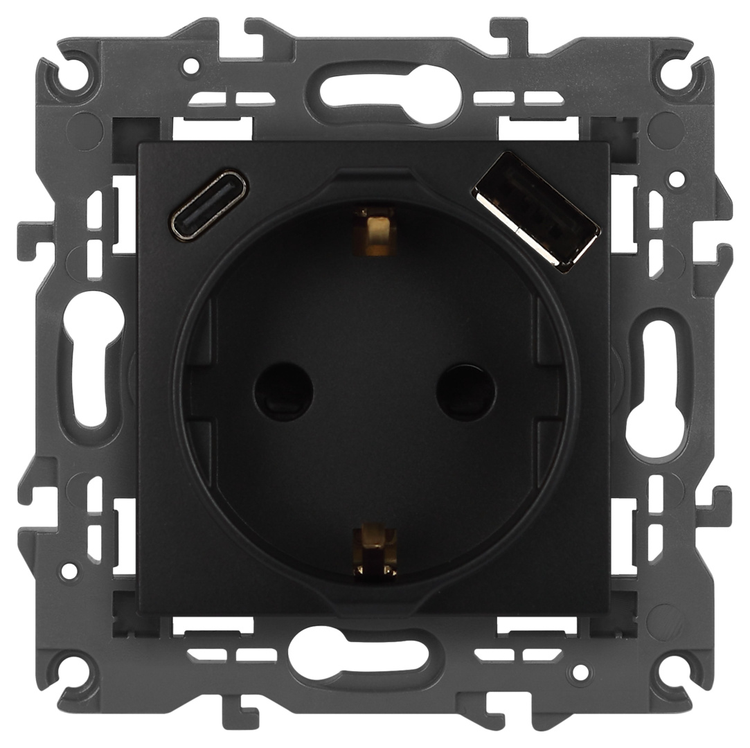 Розетка с USB A+C серии Эра Elegance 14-4108-05 цвет антрацит. Номинальные характеристики: розетка силовая – 16А 250В. Розетка USB type A – 3A 5В. Розетка USB type C – 3A 5В. Рамки приобретаются отдельно