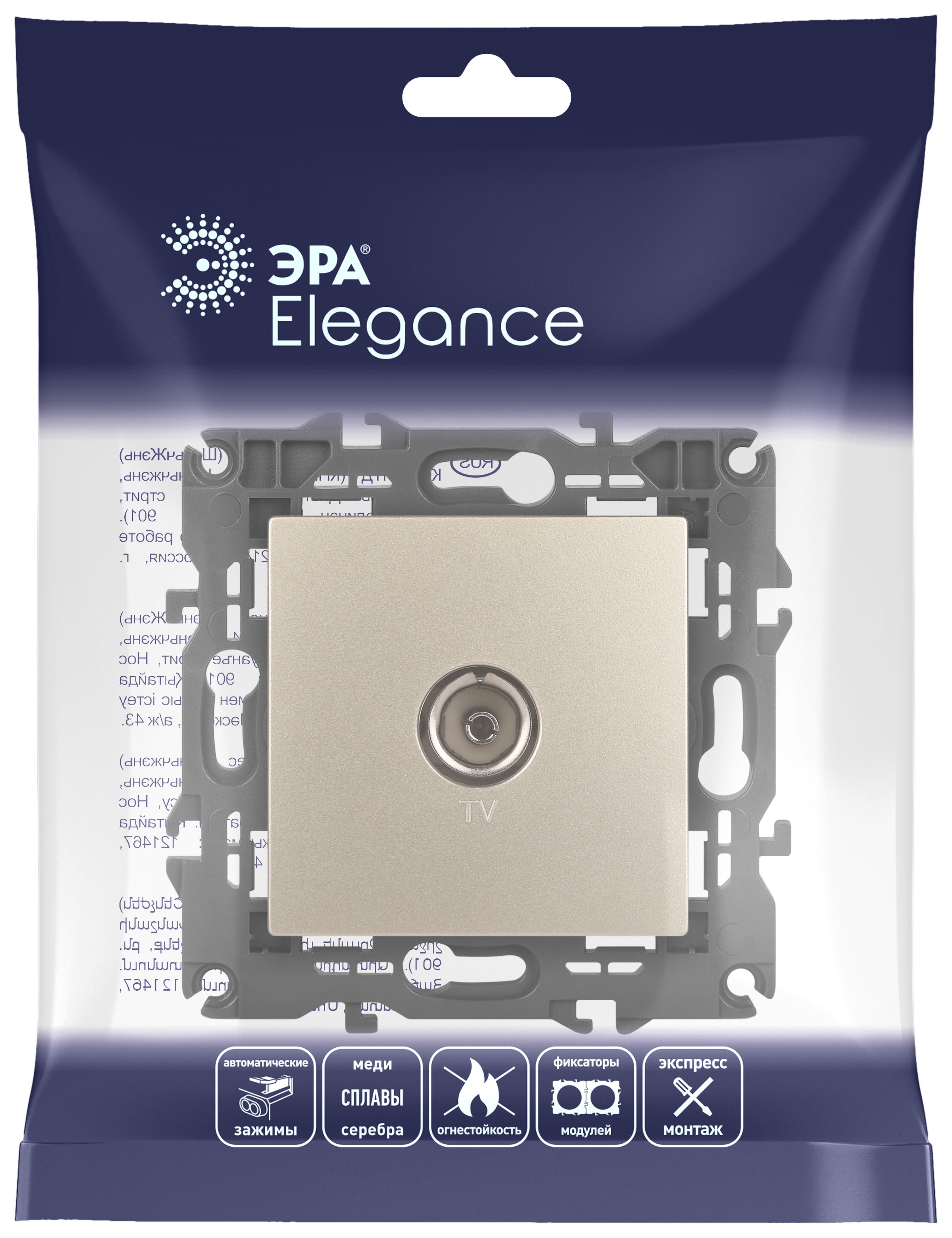 Розетка телевизионная одиночная серии Эра Elegance цвет шампань 14-3101-04. Рамки приобретаются отдельно. Рамки Эра Elegance ПЛАСТИК: 1 пост 14-5001-хх, 2 поста 14-5002-хх, 3 поста 14-5003-хх, 4 поста 14-5004-хх, 5 постов 14-5005-хх; СТЕКЛО: 1 пост 14-5101-хх, 2 поста 14-5102-хх, 3 поста 14-5103-хх, 4 поста 14-5104-хх; МЕТАЛЛ: 1 пост 14-5201-хх, 2 поста 14-5202-хх, 3 поста 14-5203-хх, 4 поста 14-5204-хх; ДЕРЕВО: 1 пост 14-5301-хх, 2 поста 14-5302-хх, 3 поста 14-5303-хх, 4 поста 14-5304-хх (хх - код цвета: 00-прозрачный, 01-белый, белёный дуб, 02-слоновая кость, 03-алюминий, 04-шампань, 05-чёрный, чёрное дерево, 07-ясень, 09-дуб, 10-венге, 11-клён, 14-медь, 21-жёлтый, 22-оранжевый, 23-красный, 25-бордо, 26-лайм, 27-зелёный, 28-голубой, 29-синий, 30-розовый, 31-мокко, 32-серый, 41-сталь, 42-титан).