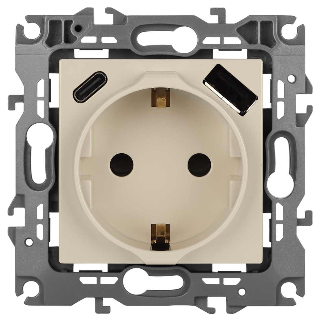 Розетка с USB A+C серии Эра12 12-4108-02 цвет слоновая кость. Номинальные характеристики: розетка силовая – 16А 250В. Розетка USB type A – 3A 5В. Розетка USB type C – 3A 5В. Рамки приобретаются отдельно