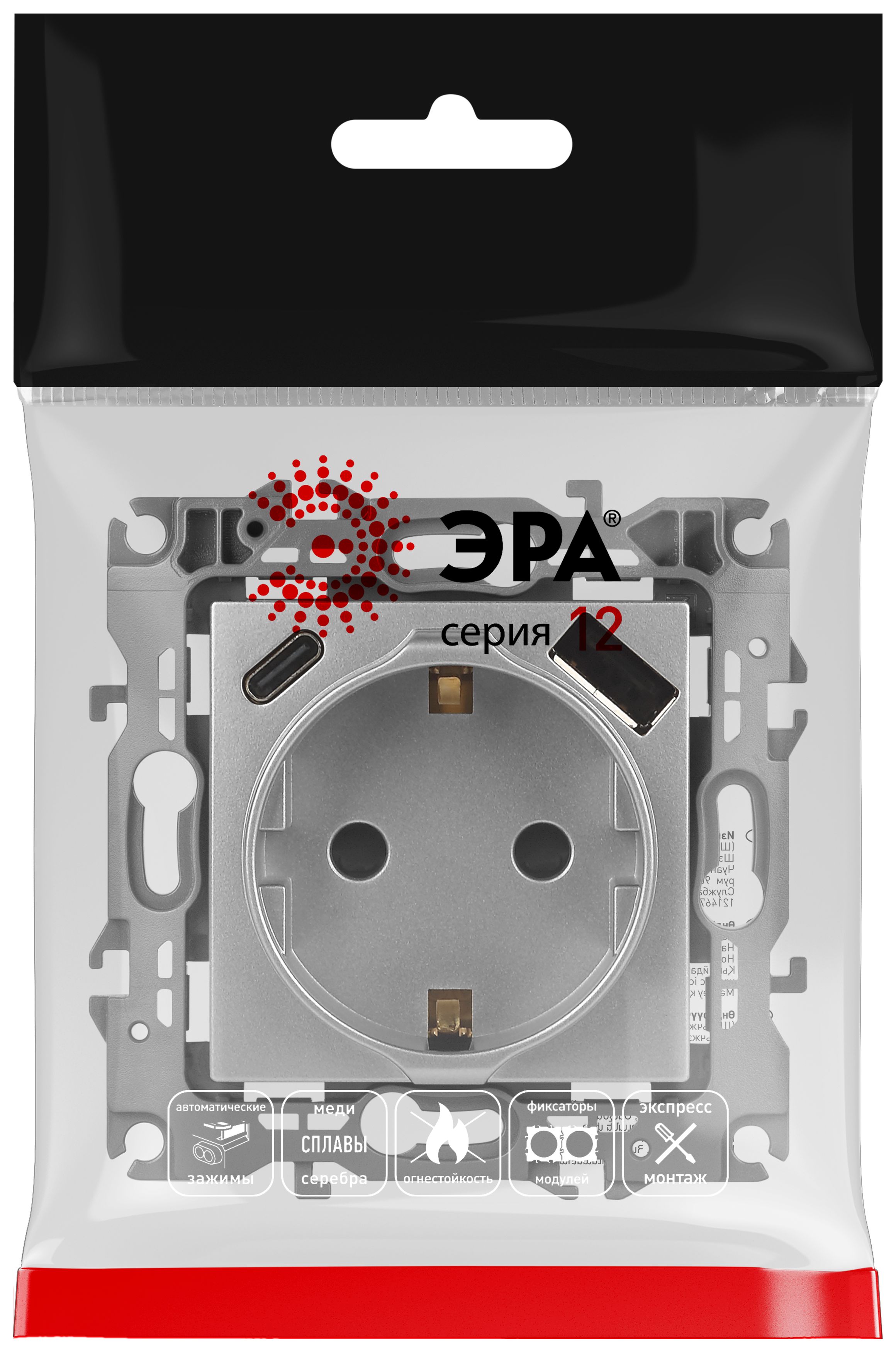 Розетка с USB A+C серии Эра12 12-4108-03 цвет алюминий. Номинальные характеристики: розетка силовая – 16А 250В. Розетка USB type A – 3A 5В. Розетка USB type C – 3A 5В. Рамки приобретаются отдельно