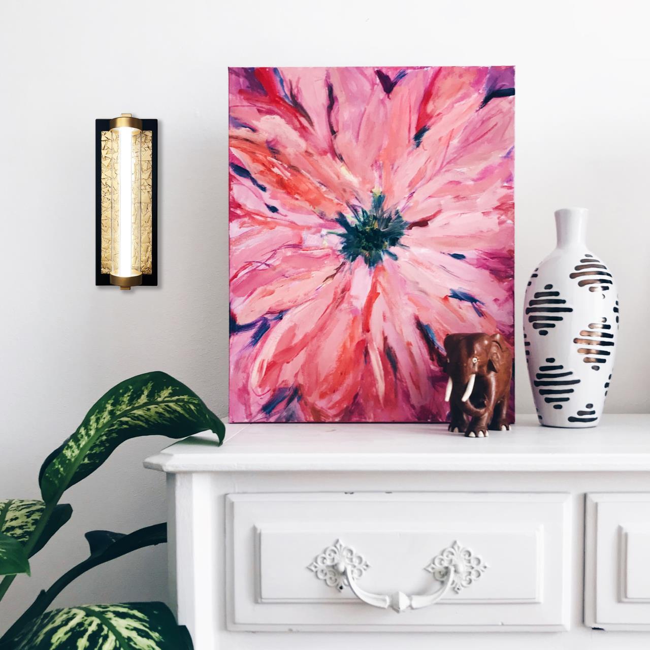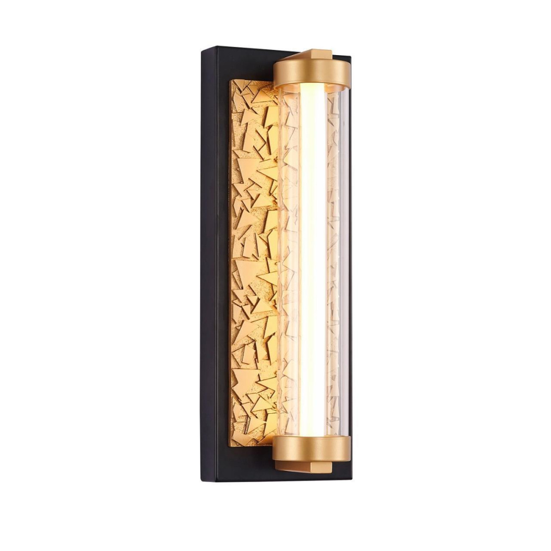 Каркас коричневого цвета с декоративной панелью, напоминающей золотые слитки, подсвечивается сквозь стеклянный плафон, внутри которого находится белая трубка со встроенным модулем LED.