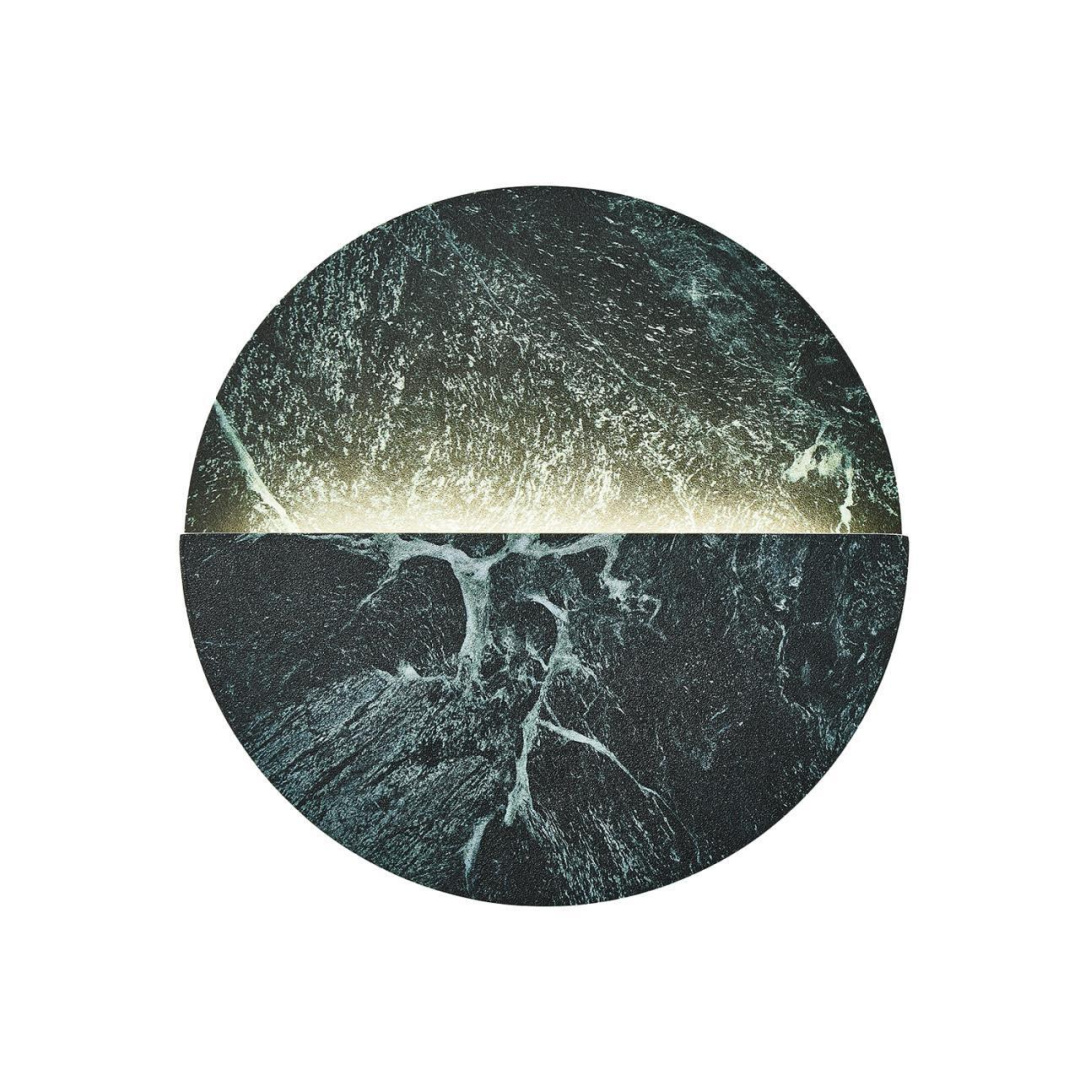 Каркас из металла черного матового цвета, декоративный элемент из двух половинок диска из искусственного мрамора (керамогранита) в цвете зеленый мрамор, LEDмодуль с рассеивателем из акрила белого цвета.