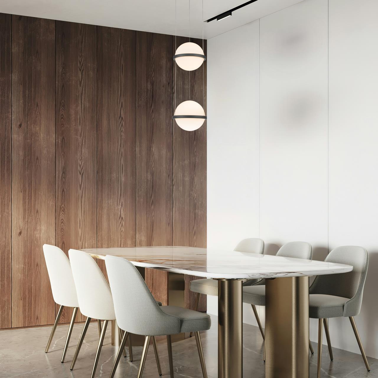 Каркас в черном цвете, плафон из белого стекла закреплен на черных металлических кольцах, LEDмодуль.