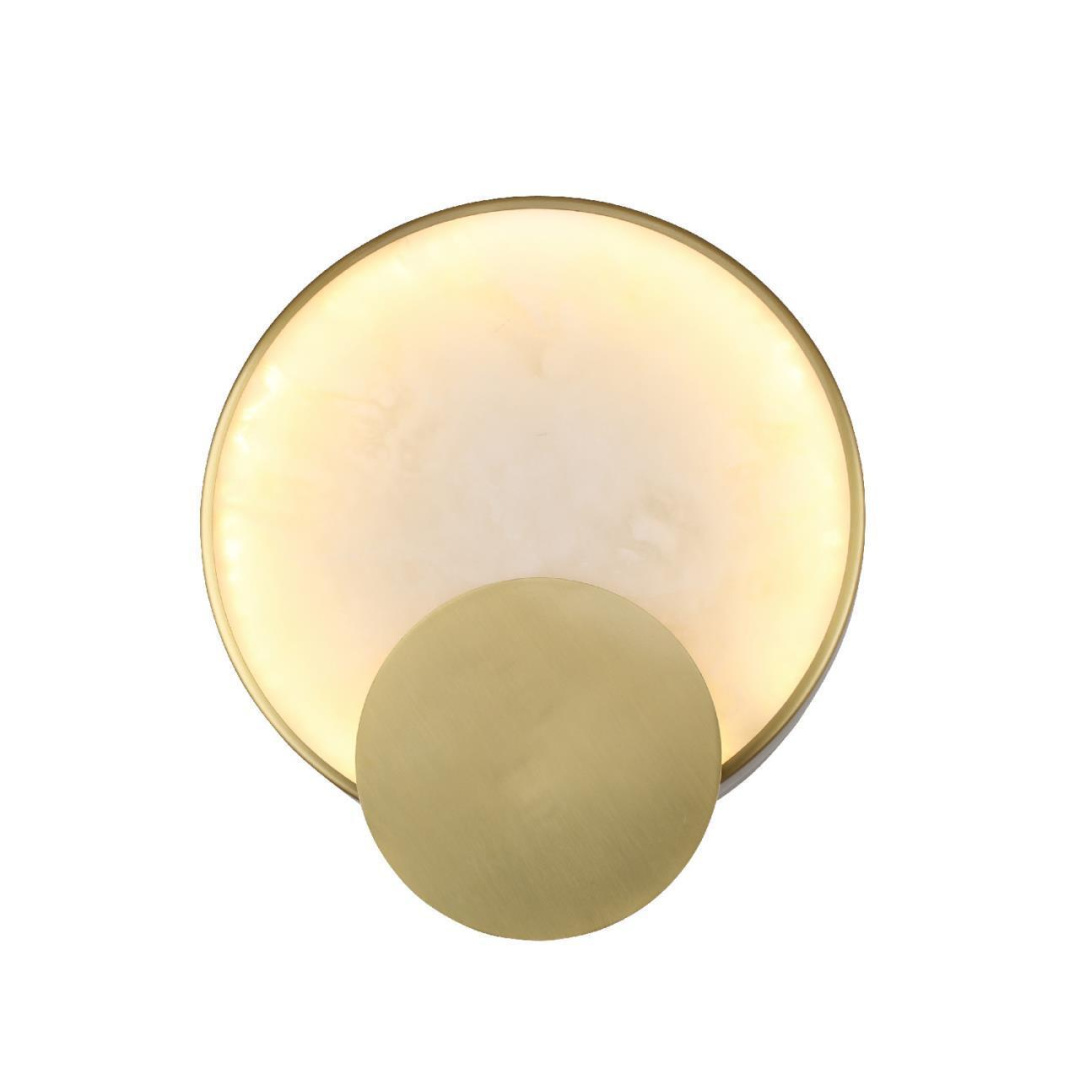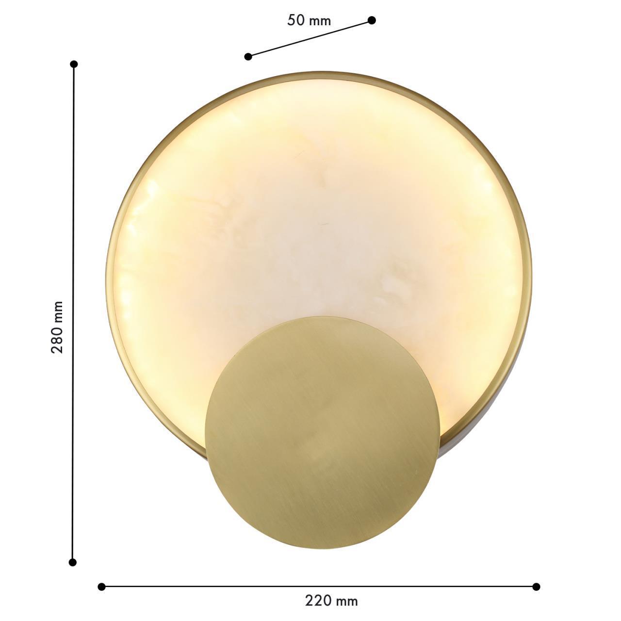 Каркас и круглый декоративный элемент из металла в цвете латунь, экран из натурального бежевого алебастра, источник света LED внутри.