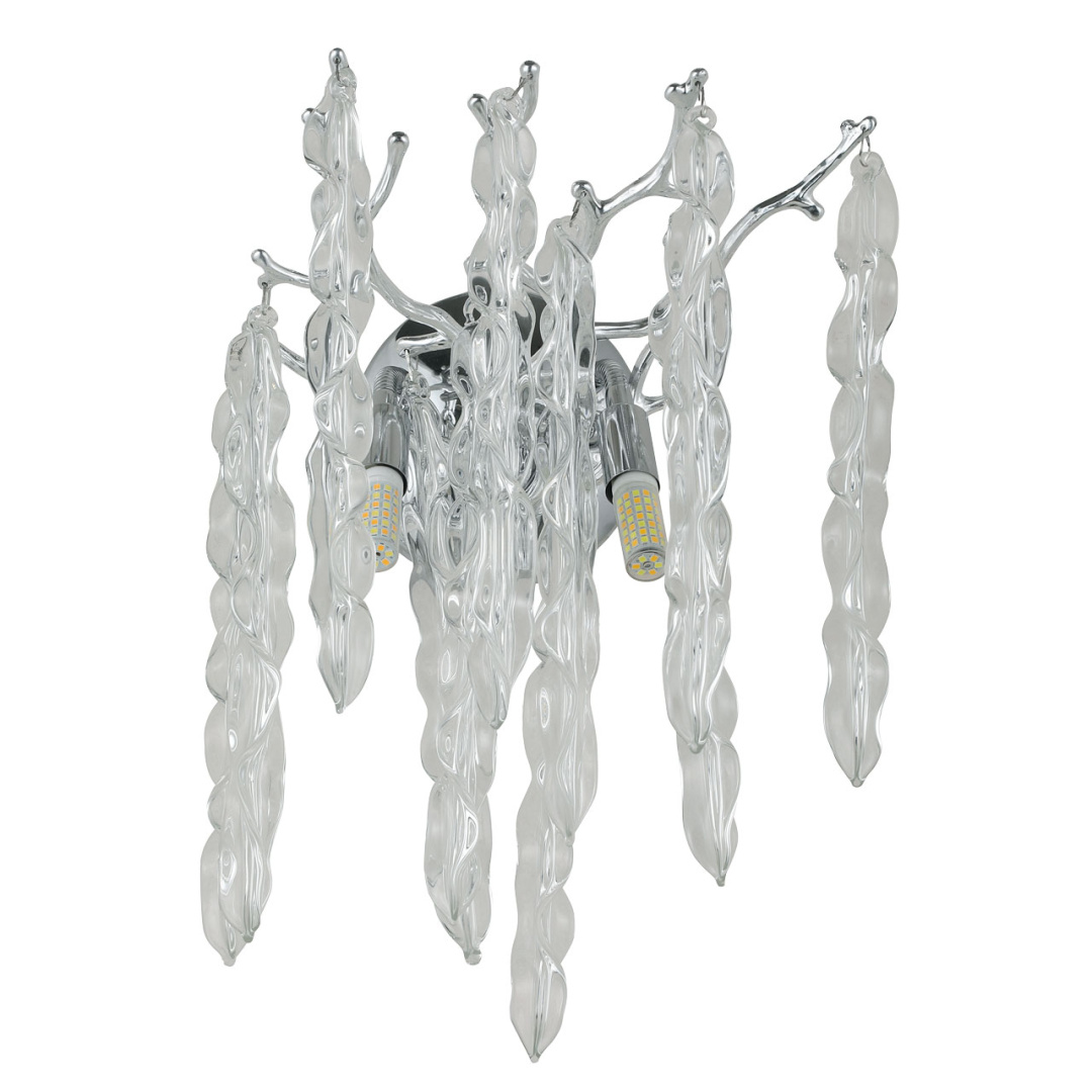 Основание настенного бра выполнено по технологии художественного литья из сплава алюминия с цинком и гальванизировано в цвет хрома. Настенное бра декорировано подвесами из прозрачного стекла оригинальной формы.