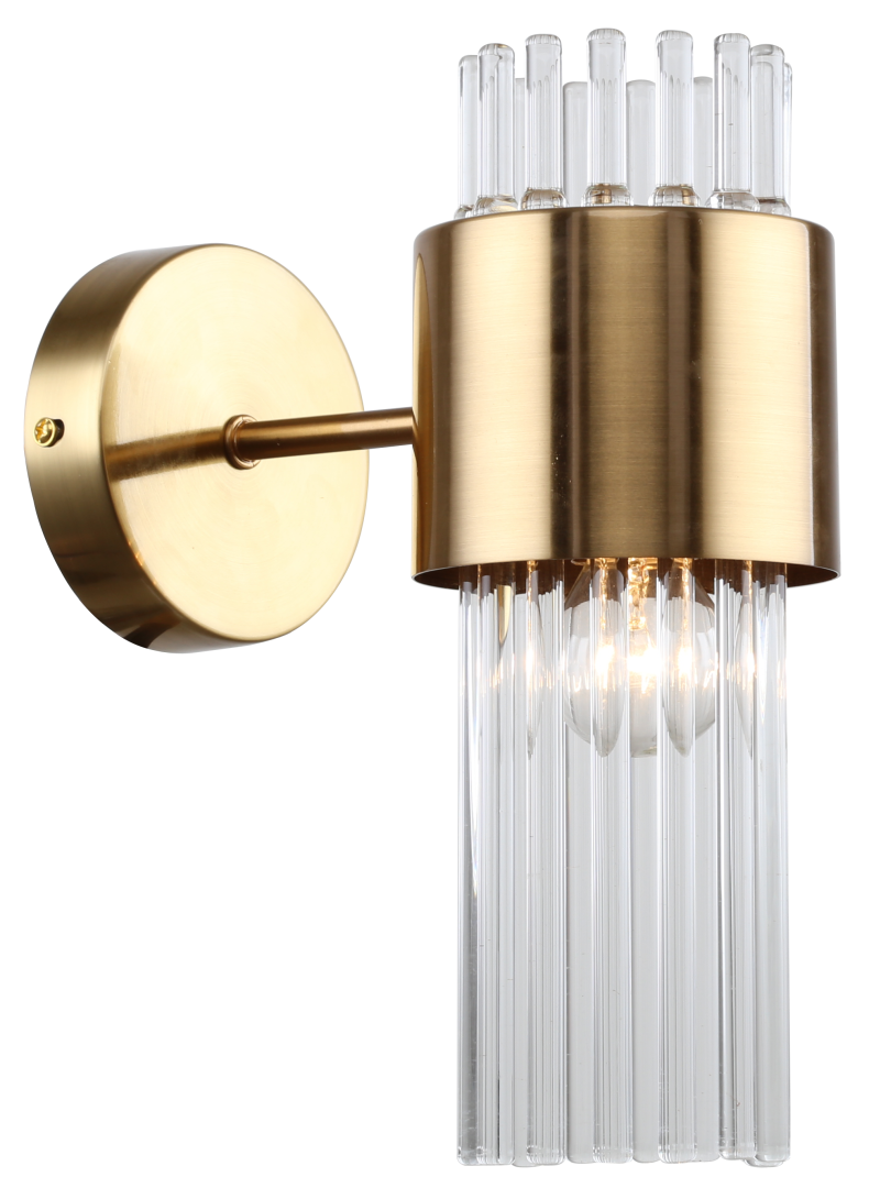 Бра настенное в цвете французское золото, с цилиндрическим плафоном из прозрачных стеклянных трубочек. Источник света для данного бра – лампа Е14 40 Вт (приобретается отдельно). Светильник настенный Rivoli Donna (арт. 3149-401) создаёт яркое дополнительное освещение. Размеры бра: 190*100*260 мм. К данному светильнику настенному можно купить люстры аналогичного дизайна: арт. 3149-305 – под 5 ламп, арт. 3149-307 – под 7 ламп. Коллекцию дополняет светильник подвесной – арт. 3149-201.