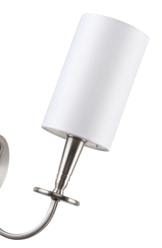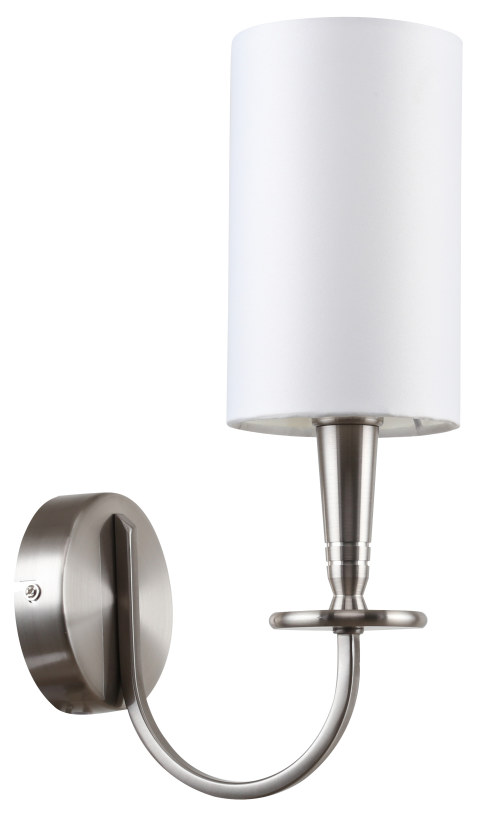 Светильник настенный из коллекции Flokky выполнен из металла, гальванизированного в цвет никеля, и декорирован вытянутым текстильным абажуром белого цвета с термостойким акрилом внутри.