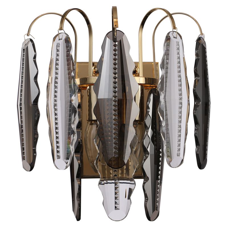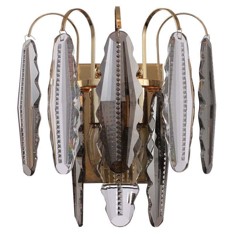 Светильник настенный из коллекции Florin выполнен из металла, гальванизированного в цвет золота, и декорирован прозрачным и дымчатым хрусталем вытянутой формы высшей категории.
