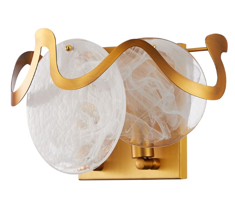 Светильник настенный из коллекции Sweet выполнен из металла, гальванизированного в цвет матового золота, и декорирован металлической волнистой лентой, гальванизированной в цвет арматуры, и круглыми пластинами из алебастрового стекла, напоминающими парящие облака. Современная форма и высокое качество светильников идеально подойдут как в классические, так и современные интерьеры.