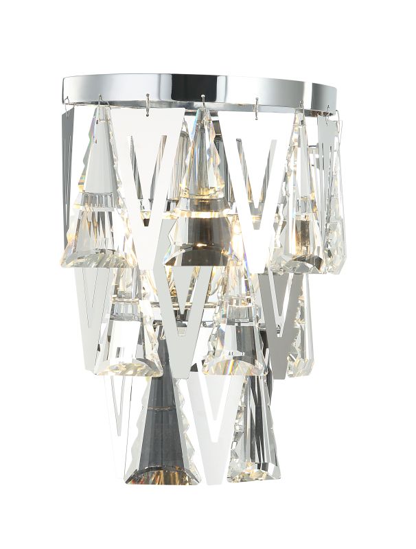 Светильник настенный из коллекции Vaviani выполнен из металла, гальванизированного в цвет хрома, и декорирован прозрачным хрусталем высшей категории треугольной формы и тонкими треугольниками из нержавеющей стали, отполированной до зеркального блеска и гальванизированной в цвет арматуры. Светильник настенный коллекции выглядит стильно и респектабельно. Премиальное качество и неповторимыи? дизаи?н светильников идеально подои?дут как в классические, так и современные дизайнерские интерьеры.