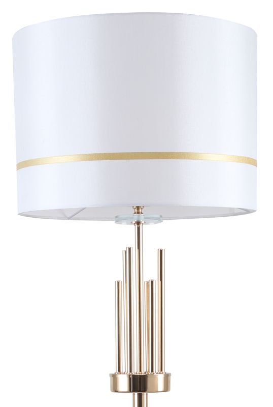 Торшер напольный из коллекции Chart выполнен из металла, гальванизированного в цвет золота, и декорирован железными стержнями в цвет арматуры. Текстильный абажур белого цвета с термостойким акрилом внутри отделан кантом в цвет арматуры. Декоративная розетка выполнена из прозрачного стекла.