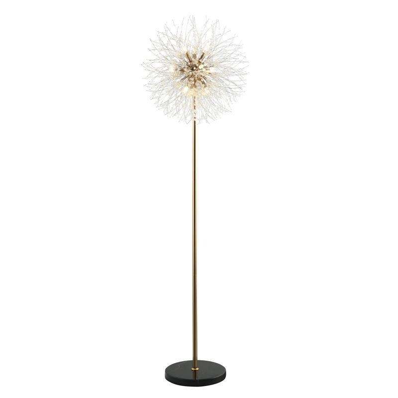 Торшер из коллекции Salut выполнен из металла, гальванизированного в цвет золота, и декорирован хрустальными бусинами, имитирующими салют. В основе торшера используется натуральный мрамор.